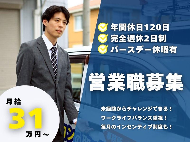 職種/仕事内容 | 仕事内容 ★-------------★ ✅未経験関係なく基本給31万円+賞与年1回 ✅インセティブ毎月支給 ✅年間休日120日+誕生日休暇制度1日 ✅完全週休2日制(土日祝休み) ✅定時出社&基本残業なし♪ ✅入社2か月で、月給80万円稼いだ先輩も♪ ✅マイカー通勤可&駐車場完備 ✅お車がない方には、社用車の貸し出しもあります ✅オフィスカジュアル ✅ネイル自由 ★-------------★ 空調設備の営業職として、 法人のお客様へ最適な設備の提案を行って頂くお仕事です。 ✅未経験でも安心! 弊社では、社員の9割が異業種・未経験からの転職です♪ 未経験時短勤務の正社員の方もいます♪ 入社後は、以下の流れで一歩ずつ成長していただけます 工事も自社でおこなっているので 外部業者とのやりとりはナシ! 設置完了までスムーズに進められます! ━━━━━━━━━━━━━━━━━━━━ 成約率40%!インセンティブもばっちり ━━━V━━━━━━━━━━━━━━━━ アポをとって興味をお持ちの方だけに 訪問する形なので成約率は40%と高め! 自分でとったアポの他に、 テレマーケティングの専門部隊が とってくれたアポもあるので、 訪問先に困ることはまずありません。 成約するごとにインセンティブが貰えるので やりがいもバッチリ実感できます! ━━━━━━━━━━━━━━━━━━━━ 営業デビューも安心!入社後の流れ ━━━V━━━━━━━━━━━━━━━━ [1] まずは基本から! トークマニュアルの暗記と、 商品研修を通じた基本的な知識を 身につけていきます。 [2] 先輩から学ぶ! まずは社内でのテレマーケティング (トークマニュアルに従ったアポ取り) の様子を隣で見て・聞いて学びます。 それから商談同行へ! 先輩と一緒にお客様のもとへ訪問し 実際の商談の流れを学んでいきます。 [3] ロープレ練習・トークチェック 先輩にお客様役になってもらい、 商談の練習を行います。 良かったところ・気になるところの アドバイスを先輩にもらいながら、 繰り返し練習をおこなっていきます。 [4] 独り立ち 上記を繰り返し、2ヶ月程で独り立ち! 【独り立ちした後のお仕事の流れ(1日のイメージ)】 ▼ ある1日の流れ(例) 9:00 出社・朝礼 チームで情報共有&準備!先輩に同行する日もあります。 10:00 アポイント先へ訪問 お客様と会話しながら、困っていることや希望をヒアリング。 12:00 ランチタイム 外出先で食べるラーメンが密かな楽しみ。先輩と一緒に行くことも! 13:00 午後の商談・現地調査 設備導入の打ち合わせや、導入後のフォローなど。 16:00 帰社&見積作成 提案に向けた資料づくりを先輩がフォローしながら進めます。 18:00 退勤! 1日お疲れさまでした◎ 直帰OKな日もあります! ━━━━━━━━━━━━━━━━━━━━ 当社について説明します! ━━━V━━━━━━━━━━━━━━━━ 当社は防犯設備、空調設備を通して ”まわりまわって人を笑顔にする会社” をモットーに10年前から東海エリアを 中心に活動している会社です。 目指すは"日本一の笑顔メーカー"! いつも感謝の気持ちを持って、 お客様も、そして自分自身も 気持ちよくなれる仕事がしたい。 そう思っている方なら、 当社は最高の場所だと 自信を持ってオススメします! ★弊社の採用サイトも是非ご覧ください!★ https://supportlife-security.com/recruit/ |