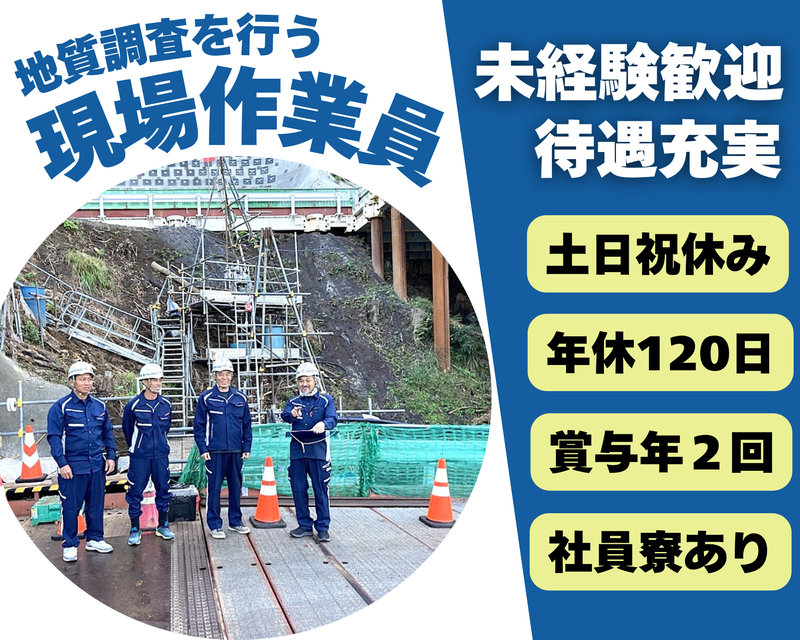 職種/仕事内容 | 仕事内容 【アピールPOINT】- ・未経験OK!地質調査を行う現場作業員 ・完全週休2日制で基本土日祝休み ・賞与年2回や社員寮など高待遇! ・無理のない勤務体制で馴染みやすい環境 - 【仕事内容】 建物を建てたり公共工事を行う前に、 土地や地面の安全性を調べる仕事。 ボーリングマシンという機械を使用して 穴を掘り、その穴から土岩の硬さや強さを 測定する等で地面の状態を調査します。 建物を建てたり公共工事を行う前に、 土地や地面の安全性などのデータを作成する仕事です。 【作業現場】 関東全域 *出張の場合もあり! - 【未経験からのチャレンジ歓迎】 入社後まずは先輩のサポート業務から開始。 (現場には基本2人1組で向かいます) 現場での経験を積みながら、 徐々に出来ることを増やしていってください。 資格取得の支援もございますので、 業務に必要な資格は働きながら取得可能! 3~5年程度で一通り業務ができるようになり、 チーフ(職長クラス)に昇格、 後輩スタッフを連れて現場に出ることが 出来るようにステップUPしていくイメージです。 - 【会社について】 当社は大手地質調査会社や 県・都・官公庁などからご依頼をいただき、 地質・土質調査、測量、建設工事に関する コンサルタント業務を行っている会社です。 近年、自然災害が増えているのもあり、 地盤調査の重要性が注目されています。 今後もより精度の高い業務を行っていくため 新たに正社員としてスタッフを募集! ✓会社HP https://www.sakageo.co.jp/ ✓採用サイト https://lp.sakageo.co.jp/ - |