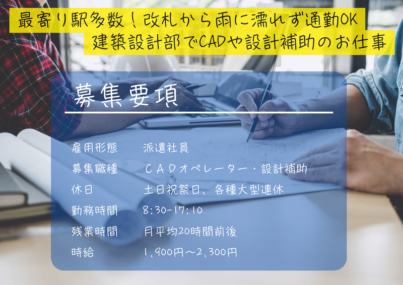 対象となる方 | 求めている人材 AutoCADやVectorWorksを使用した建築意匠図の作図、修正経験 (物件は問いません) 前職で比較的長くお勤めのご経験のある方 (年単位で勤務される方が多い職場の為) 詳しくは専門の弊社スタッフまでお気軽にご相談ください。 |
