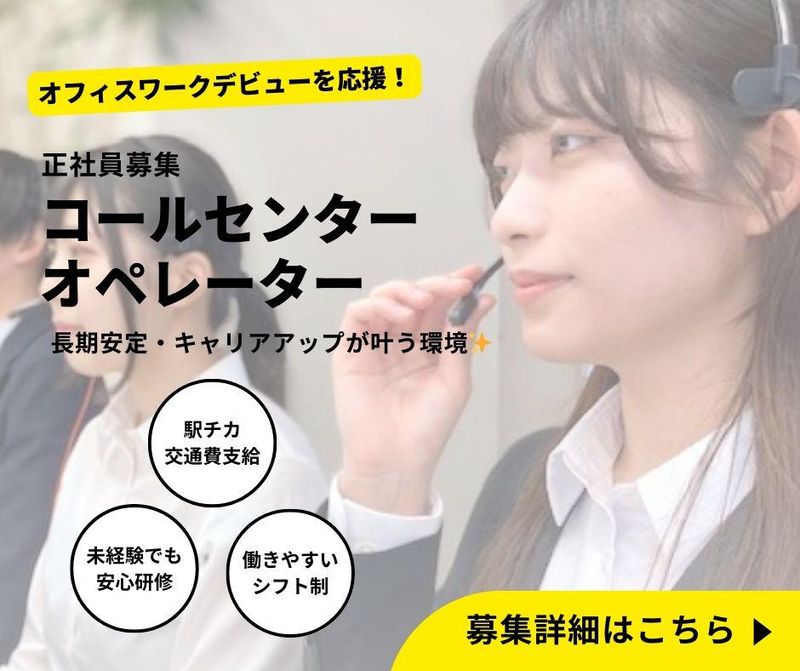 職種/仕事内容 | 仕事内容 :★未経験からオフィスワークデビューしたい方必見★: ◎扱うのは大手優良企業のサービス ◎駅直結の好立地で雨の日も通勤楽々 ◎お客様対応は台本ベースで安心 ◎正社員登用制度&キャリアアップサポートあり CMを見てお問い合わせいただいたお客様や 資料請求いただいたお客様へサービスのご案内、 ご提案業務を担当していただきます! ■研修制度に自信あり! 約1ヶ月の研修で、お客様対応のマナー、 言葉遣いなど基本から学べるので未経験でも安心◎ *もちろん経験者も大歓迎です* ■仕事と私生活を両立! 月平均残業時間2.7時間だから ワークライフバランスばっちり♪ ■1ヶ月勤怠なしで追加手当! シフトを遵守すれば給与+αで7000円/月の 精勤手当が付与されます! ■嬉しいお弁当補助付き! 当社ではお弁当を1食200円で提供♪ メニューは日替わりなので、毎日食べても飽きませんよ◎ ■定期面談で今後のキャリアをサポート! 長く腰を据えて働きたい方には正社員登用の道も◎ キャリアアップ研修も充実しており、 希望に沿った働き方を選べます! プライベートを充実させつつ、 ぜひ一緒に働きませんか? ご応募お待ちしております(^^)! ※入社タイミングや経験を考慮し、 別のセンター(京橋)の配属をご案内する可能性があります |