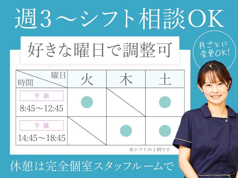 勤務時間 | シフト制 勤務時間詳細 平日2日の勤務、土曜日1日の勤務が可能な方を歓迎! 【基本的な就業時間】 (月・火・木・金・土) 午前/8:45〜12:45(実働4h) 午後/14:45〜18:45(実働4h) 休憩/12:45~14:45(2時間) 休診/水・日・祝 ※受付開始は診察開始時刻の15分前 ※受付終了は診察終了時刻の30分前 ✨扶養内勤務・副業・Wワーク歓迎 ✨休憩時間の一時帰宅も可能 ✨平日の曜日は相談OK ✨週3日~OK ✨半日勤務のシフトもあり |