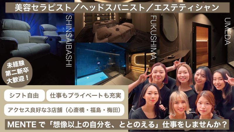 職種/仕事内容 | 仕事内容 ==================== \\ MENTEとは?// ⭐ヘッドスパ、フェイシャルエステ、脱毛、 アイブロウ、個室サウナ等を運営する、 トータルビューティーサロンです。 ⭐「ココロとカラダを整える、 特別な“ととのい”体験」を届ける、 これまでとは違った美容サロン! ⭐ここ3~4年で2店舗増設! 出店も加速させている、 成長中の企業です♪ ⭐無資格・未経験の方も、 「本気で顧客に向き合いたい!」 「仕事を通して成長したい!」 という気持ちさえあれば、 応募可能です♪ ==================== <主な仕事内容> お客様の「最高の癒やしと美」を 引き出す美容セラピストとして、 カウンセリングと美容施術、 店舗運営全般をお任せします。 【具体的には】 ◆お客様対応(予約受付・接客・会計等) ◆店舗業務全般 (施術室やサウナ室の掃除・準備・ タオル他備品の監理) ◆SNS運用 (TikTok等で店舗の魅力を発信) 施術メニュー例: ・ヘッドスパ ・肩甲骨はがし ・フェイシャル ・脱毛 ・アイブロウ 等。 ※店舗によって カウンセリングにてお客様のお悩みや ご希望を丁寧にヒアリングし、 最適なメニューを提案します。 全てを施術していただくわけではなく、 適正に合わせて配属を決めます。 未経験の方も、一から研修していきます! <以下のいずれかの店舗に配属> ▼店舗ごとに特色があります! 【梅田店】 梅田の一等地にある ラグジュアリーなお洒落空間。 プライベートサウナが人気。 【はなれ福島店】 1棟貸切空間。 1Fはプライベートサウナがあり、 2Fでボディケア等の施術を行います。 【心斎橋店】 完全個室のラグジュアリーサロンで施術。 ※サウナ施設なし 梅田店・心斎橋店は、 ヘッドスパ、肩甲骨はがし、フェイシャル、 脱毛、アイブロウ等美容施術全般、 はなれ福島店はサウナとボディケアが中心です。 |