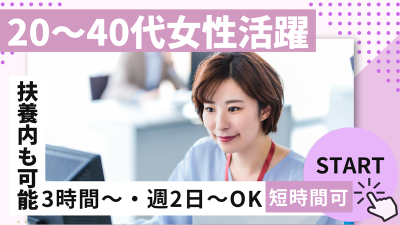 対象となる方 | 求めている人材 簡単なExcel・PC操作が出来る方 ★20代/30代/40代活躍中 ★女性活躍中・主婦活躍中 ★業界経験不問・無資格歓迎 ★扶養内勤務歓迎・短時間勤務も可能 \育児や家事との両立も応援!/ お子さんの急な体調不良にも柔軟に 対応します! 主婦パート・子育てママさんも 多数活躍中の職場なので、 働いてから新しいママ友が出来た♪ と嬉しいお声もいただいています! ╭━━━━━━━━━━━━╮ こんな経験も活かせます! ╰━v━━━━━━━━━━╯ ・一般事務 ・事務スタッフ ・事務員 ・オフィスワーク ・デスクワーク ・営業事務 ・経理事務 ・総務事務 ・人事事務 ・データ入力 ・受付事務 ・医療事務 ・学校事務 ・教育事務 ・データ入力 ・データチェック ・書類作成 ・ファイリング ・電話対応 ・来客対応 ・メール対応 ・PC入力(Excel・Word) ・書類整理 ・請求書作成 ・書類管理 など |