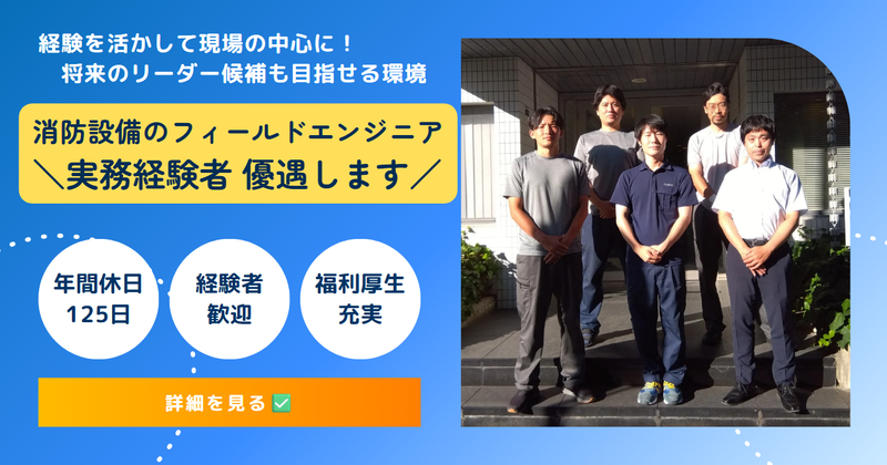職種/仕事内容 | 仕事内容 -✨アピールポイント✨- ■年間休日125日&賞与年2回 ■資格を活かして働ける◎ ■地域の安全を守るやりがいのある仕事★ - ✅現場での実績を活かして、次のステップへ進みたい方にピッタリです! 【具体的なお仕事】 消防設備の点検・保守・施工をお願いします。 ◆点検 └(安全性の確認、報告書の提出、 見積書作成、修理手配) ◆設備工事 └(自動火災報知機等のリニューアル工事) └(マンション管理会社との調整や提案、 安全な工事の進捗のための管理・指示) 【安心ポイント】 資格を活かしつつ、キャリアアップできます◎ キャリアアップの例として、支店全体を管理するマネージャーに昇格も! 社員が口をそろえて言うのが 「みんな親切」ということ。 みんなで助け合う風土ができているので、 きっとすぐに慣れていただけると思います。 【当社について】 1953年の創業以来、 消防設備の施工・メンテナンスを 通じて人々の安全を守り続けてきました。 特に防災ベルの国内シェアはトップクラスで、 多くの大手企業や病院、学校、オフィスビルに 当社の機器が導入されています。 《もっと働きやすい企業へ!》 歴史のある安定企業ですが、 当社は現在第二創業期ともいえる、新たな成長期に入っています。 たとえば、まだまだアナログが主流のこの業界において、実績のデータベース化やビジネスチャットツールの導入などが進行中。 当社の良さの一つでもある、家族的な社内雰囲気を残しつつ、 スタッフはもちろん、全社員の意見やアイデアに耳を傾け、よりよい会社づくりに全社で取り組んでいます。 もちろん、ワークライフバランスの両立もできます! ◎年間休日125日 ◎完全週休2日(土日祝休み) ◎福利厚生の充実 など 安心して働ける環境をご用意し、 あなたのご入社をお待ちしています! |