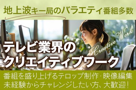 職種/仕事内容 | 仕事内容 ★ココがポイント★ ・20代・30代が活躍中の活気ある職場★ ・未経験からでもテレビ・映像業界に! ・事前研修アリで安心してお仕事開始できる♪ ・クリエイティブなお仕事・個性が活かせる! ・髪型・髪色・ピアス自由 <紹介先の会社はこんなトコロ!> <会社説明> 主にテレビ・ラジオ番組の企画・構成・演出/プロデュースをしています。 その他、スポーツ・音楽・芸術に関する興業の企画立案並びに運営、 広告代理店業務などの事業も多岐にわたり手掛けています。 海外の取材実績は90カ国以上! 誰もが知ってる有名なテレビ番組に携わり、 世界を股にかけ人気番組を制作しています! <どんな人が働いているの?> “誰かに使われる”立場でキャリアを終えるのではなく、 日々アイデアを出しあい、助け合いながら、 ゼロから作り上げることに意欲満々な社員が多く活躍しています! <コーディネーターより> 目標は、テレビの世界でメシを食っていける『テレビ番組制作集団』になること。 ゴールデン枠の番組作りができるテレビマンを育てていきたいと思っています♪ 自分の見聞もどんどん広がっていきますよ。 とにかくテレビ番組を作ってみたい!という熱意のある方歓迎! 経験のあるなしは問いません!! 「オモシロイ」「為になる」「ワクワクする」 一緒に作り上げる仲間大募集! (派遣・請負) <気になった方はこちらもチェック★> ▼富士巧芸社のホームページ https://www.fujikoogei.co.jp/ 「富士巧芸社」で検索♪ ▼富士巧芸社のSNSアカウント ★tiktok https://www.tiktok.com/@fujikoogei.official 「fujikoogei.official毎日エンタメ大冒険!」 ★instagram https://www.instagram.com/fujikoogei.official/ 「fujikoogei.official」 具体的には・・ テレビ番組のテロップ入力や編集業務をお任せします! 一部、映画・アニメ・動画・MV・WEBドラマなどの動画編集・テロップ入れ作業も発生します。 未経験でも、イチから丁寧に教えるので安心です♪ できることから、まずは慣れて行きましょう! <編集・EDのお仕事について> 「表」で人前に出るというより、 「裏」で自分の色を出すオシゴト。 <テレビ番組の編集スタッフ> 番組作りは撮影当日だけじゃない。 「テレビ番組を作る」本当の主役はあなたです。 テレビといえば、 タレントさんやプロデューサーなど「表」の仕事に目が行きがち。 だけど、「テレビ番組がテレビ番組たり得る」のは編集さんがいるから。 「映像」から「番組」へ、 あなたの活躍が「おもしろい」を作る。 (派遣・請負) 例えばこんなオシゴト ・映像編集 テロップ入れ、CG等映像素材をつなげる編集 ・映像、画像素材の修正 ・カット毎の確認、仕上げ 制作プロデューサーやディレクターの要望を確認し、 映像を完成させていきます。 あなたの力で番組の面白さが決まります! テレビ業界に興味のある方大歓迎 20代のスタッフ中心に活躍中です 簡単なPCの操作ができればOKなので 未経験でも全然大丈夫です! <こんな方歓迎> ・テレビや映像に興味がある方 ・モノづくりが好きな方 ・チームワークをもって働ける方 ・流行りに敏感な方 ・好きなことや打ち込めることがある方 ・ワイワイした場所で働きたい方 ・面白いもの、面白いことが好きな方 ・いつか新しい番組を作ってみたい方 ・人と違う仕事がしたい方 ・動画編集が好きな方など 1つでも当てはまる方は是非ご応募ください! <テレビ関係ならではの楽しみを聞いてみました!> ・ロケでいろんなところに行ける ・ロケ弁がおいしい(笑) ・ロケ先や打ち合わせで、おいしいものが食べられます! ・普段は入れないところに行ける! ・業界特有のワクワク感がある ・有名人に会えるのもテレビならでは ・仲間との結束・チームワークが強い! |