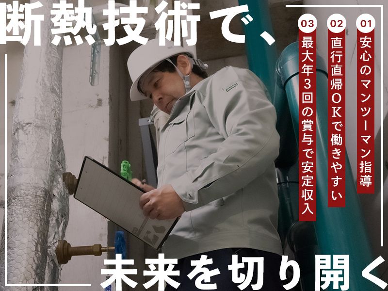 対象となる方 | 必要資格・経験 <必須> ・普通自動車免許(AT限定可) <歓迎> ・熱絶縁工事の経験 【POINT】 ・20代活躍中 ・50代活躍中 ・60代活躍中 |