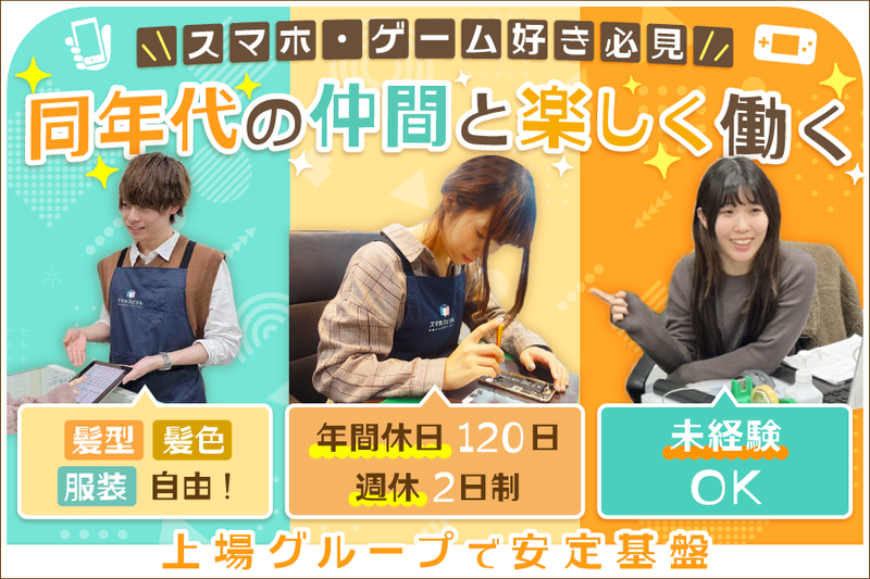 職種/仕事内容 | 仕事内容 /⋰ ✧未経験から正社員デビュー✧ 学歴や経験は一切不問! スマホ修理のオープニングスタッフを大募集! \⋱ 「フリーターから安定したい...!」 「学歴・職歴がなくても活躍したい...!」 そんな想いをお持ちのあなた! ぜひ私たちと一緒に働きませんか? ー*ー*ー*ー*ー ✼* ┈当社の魅力Point┈✼* ✧働きやすい職場環境 ✧ ✓完全週休二日制 ✓年間休日120日 ✓平均残業10h以下 など 働きやすい環境が整っており プライベートとの両立も可能です! ✧髪色・服装自由、ネイル・ピアス可✧ 好きな服装で、お洒落を楽しみながら 自分らしく働ける職場です◎ ー*ー*ー*ー*ー 【 仕事内容 】 スマホやタブレット、ゲーム機などの 修理や接客業務全般をご担当いただきます! 《具体的には...》 ■受付・接客 「スマホの充電の減りが早くて...」など お客様からのご相談に応じて 修理の内容とお見積もりをお伝えします。 ■修理・操作サポート等 スマホのバッテリー交換や部品交換、 データ移行や設定代行、 データ削除などを対応します。 …*取り扱い製品*… ◎スマートフォン(iPhone、Android) ◎タブレット(iPad) ◎ゲーム機(Nintendo Switch、Nintendo 3DS、PS5)…など 【 入社後の流れ 】 1~2日目: 座学研修で基礎を習得 3日目~2か月: 研修センターでOJT。 修理練習や接客ロールプレイなど 3か月目以降: 配属先で実務スタート! 先輩のサポート付きで安心 研修を通して平均3~6ヶ月程度で 独り立ちを目指せます◎ 【アピールポイント】 *✰ノルマがなくマニュアルも完備✰* 「スマホ修理って難しそう...」 そんな方もご安心ください! わかりやすいマニュアルや 先輩のサポートがあるので、 未経験スタートでもご活躍いただけます! *✰上場企業のグループ会社で安定✰* 日本PCサービスのグループ会社なので、 安定基盤のもと、安心して 長期で働くことも可能です◎ |