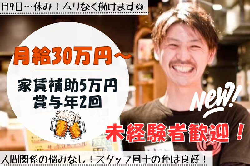 職種/仕事内容 | 仕事内容 ・。・゜☆゜・。・゜★゜・。・゜☆ 月給30万円~&家賃補助5万!?✨ オイシイ話、全部ウチにあります ・。・゜☆゜・。・゜★゜・。・゜☆ ++働くうえでのポイント++ ✅週休2日制(月9回~) ✅月給30万円~ ✅家賃補助5万円支給 ✅業績賞与年2回 ✅引っ越し手当あり ✅髪色・髪型自由 ✅ネイル・ピアスOK 【仕事内容】 店舗運営全般を担当していただきます。 ◇調理 ◇発注業務 ◇スタッフの育成・シフト管理 ◇メニュー開発や店舗の企画 など 【当社の強み5選】 ①多角経営で安定&柔軟! 飲食にとどまらず、建築・リフォーム・不動産も展開! 枠にとらわれない"新しいお店づくり"が可能 ②キャリアアップ&新しい挑戦もOK! 店長・マネージャー・商品開発・コンサルなど、多彩なキャリアを自分で選べます! ③プライベートも大切にできる環境! ◎月9日休み/週休2日制 ◎髪型・髪色・ネイル・ピアス自由 ◎焼肉のまかない付き ④年2回の昇給チャンス! お客様の声&成果でしっかり評価! 頑張り次第でどんどん給与UP⤴ ⑤経験でも安心の研修制度! 先輩と一緒に実務を学べるので安心♪ 聞きやすい&相談しやすい職場です! アピールポイント: 【企業のビジョン】 私たちが目指すのは―― 「働く人がワクワクできる会社✨」 飲食事業に限らず、新規事業にも積極的に挑戦中! 「利益」だけでなく、関わる全ての人に“おもてなし”を大切にしています。 チームで結果を追う「一体感」ある社風です◎ 【年収例】 ★23歳(入社1年目) …年収360~400万円 ★32歳(入社1年目) …年収500万円(月給40万円+諸手当) / 今後のキャリアパスは…? →店舗マネージャー/商品開発/新業態立ち上げ/コンサル業/マーケティングなど、 幅広くご用意しています◎ \ 飲食の常識をくつがえす働きやすさ! 「次こそ長く働けそう」そう思ったら、ぜひ当社へ♪ |