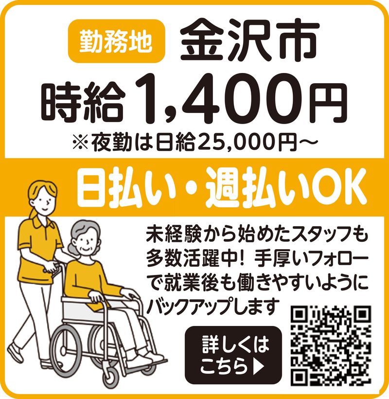給与 | 時給1,400円 給与詳細 基本給:時給 1400円 ☆夜勤の場合は日給25,000円〜 |