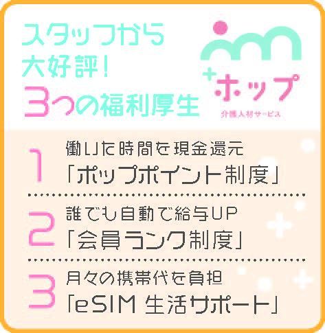 職種/仕事内容 | 仕事内容 グループホームでの勤務になります。 主に生活支援をお願いします。 負担の多い身体介護のような仕事は少なめ。 利用者様が施設内で快適な生活を送る為の介護サービスを提供するのが主な業務になります。 身体介護(食事・入浴・排泄など)や、日常生活サポート(掃除・洗濯など)を行います。 【株式会社プラス・ピボットとは?】 介護人材を軸とした人材派遣サービス、人材紹介サービスを展開しています。 派遣スタッフさんを大切にすることが、その先にいるお客様に最高のサービスを提供できる。 「はじめる方」より、「続ける方」を支援する人材サービスです。 【ここがPOINT】 ・ポイント制度あり◎!時給にプラスαで自分にご褒美を! →時給に加え、勤務時間に応じてホップ・ポイントを付与します。 溜まったポイントは「現金還元」! 実質の年収アップになりますよ♪ ・明確な評価基準! →勤務時間に応じて、会員ランクがアップ! ランクが上がることで「会員特典」あり♪ 派遣先が変わってもランクはそのまま引き継ぎます! ・生活サポートで毎月の出費が減る! →携帯料金を当社が負担します。 国内通話かけ放題! 「お友達と好きなだけ」「パケット通信50GB」! お仕事期間中は、ずーっと当社が負担します♪ |