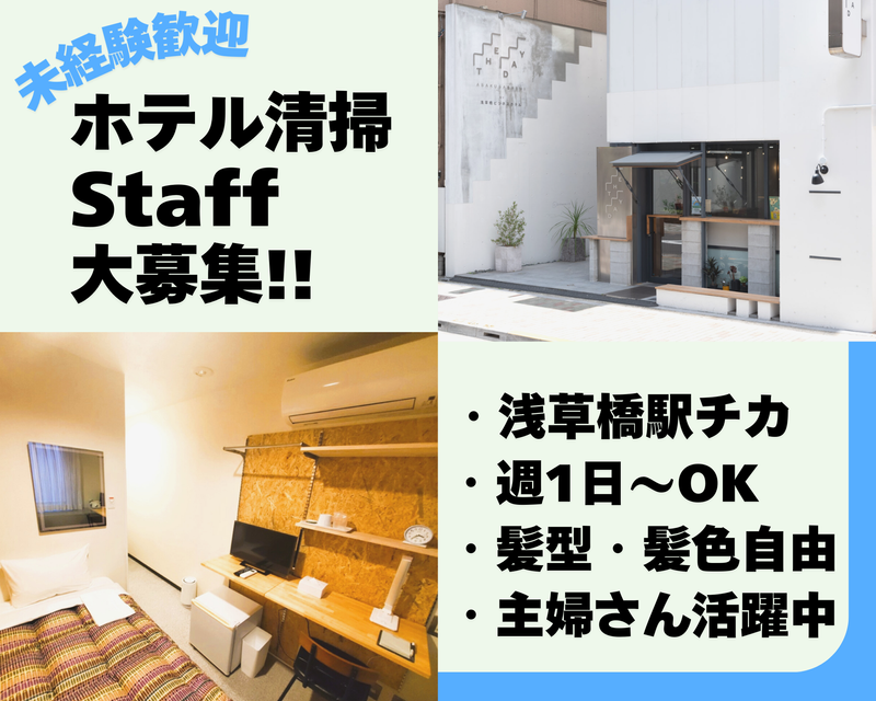 職種/仕事内容 | 仕事内容 \\30代〜60代の主婦さん多数活躍中// 【浅草橋駅から徒歩すぐ!】清潔感あふれる ビジネスホテルの清掃スタッフを募集します 家事と両立しながら働ける、和やかな職場!  ̄ ̄V ̄ ̄ ̄ ̄ ̄ ̄ ̄ ̄ ̄ ̄ ̄ ̄ ̄ ̄ ̄ ̄ ̄ ✅未経験歓迎&丁寧な研修ありで安心♪ ✅週1日〜OK、希望曜日の相談もOK! ✅扶養内勤務やWワークにもぴったり! ✅制服貸与&服装・髪色・ピアス自由 ✅日祝は1500円+手当(祝日歓迎) ✅10時〜15時の働きやすい時間帯! ・・・・・・・・・・・・・・・・・・・・・・・・・・・・・・・・・・・・・・・ ⏩仕事内容⏩ 浅草橋ビジネスホテルでの清掃業務をお任せします。 ■客室清掃 :ベッドメイキング :室内の掃除機がけ・拭き掃除 :アメニティの補充 <1日5〜10部屋程度を担当します> 前日のチェックアウト後〜午後のチェックインまでの時間で作業します。 ■共用部清掃 :ロビー・廊下 :ワーキングスペース :シェアハウス内のコインランドリーなど ※業務量はスタッフ間で均等に調整します! ※先輩スタッフが丁寧にサポートします! 未経験の方も安心の環境です◎ ・・・・・・・・・・・・・・・・・・・・・・・・・・・・・・・・・・・・・・・ ⏩職場のホテルについて⏩ 清潔感が人気の秘訣!お客様からも高評価! 居心地の良さを大切にしています。 ウッド調の家具や植物が多く、 落ち着いたリゾート感のある空間です! 建築から30年以上経っていますが、 リノベーション済みで清潔感のある快適なホテルです。 また、ワーキングスペースやシェアハウスも併設しています。 ▶勤務地:浅草橋ビジネスホテル ▶HP:http://www.abh.co.jp/ ・・・・・・・・・・・・・・・・・・・・・・・・・・・・・・・・・・・・・・・ ⏩一緒に働くスタッフについて⏩ スタッフは40代〜70代の女性が中心です。 「優しい人ばかり!」と評判の和やかさ。 人間関係のストレスはありません! \\⯎こんな方が活躍中です!⯎// ●子育てがひと段落した主婦さん活躍中! ●日中の時間を有効活用したい方 ●キレイ好き・コツコツ作業が得意な方 ●未経験でも安心して始めたい方 人間関係を大切にしたい、 優しいスタッフばかりの職場で働きたい、 和やかな雰囲気の中で長く働きたい、 そんな方にもおすすめの職場です◎ ・・・・・・・・・・・・・・・・・・・・・・・・・・・・・・・・・・・・・・・ |