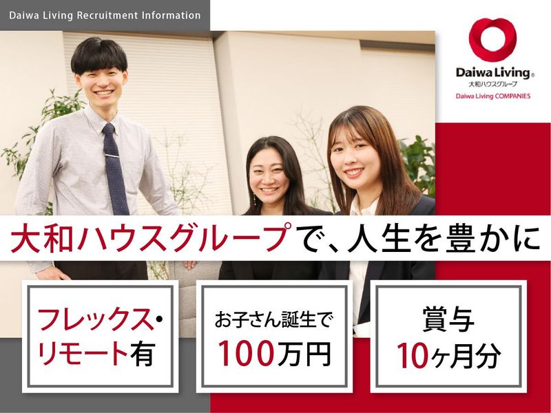 職種/仕事内容 | 仕事内容 ____________________ ✿業界トップクラスの福利厚生と働き方を実現✿  ̄ ̄ ̄ ̄ ̄ ̄ ̄ ̄ ̄ ̄ ̄ ̄ ̄ ̄ ̄ ̄ ̄ ̄ ̄ ̄ ◎<学歴不問>不動産業界での営業経験者を募集! ✔東証プライム上場「大和ハウスグループ」 ✔「転勤なし」でも2年目年収500万以上! ✔水・日・祝休みの完全週休2日で年休123日 ✔有休取得も推奨(平均取得日数11.4日/2023年) ✔お子さん誕生で「100万円支給」など手当充実 ✔フレックス導入&15時に帰れる「プレミアムデー」 ✔育休は最長3年取得可能で男性女性問わず活躍中 ✔不動産業界でも残業は少なめ(月平均21時間) ✔賞与10ヶ月、住宅手当や社宅制度で生活安心 ◎業界内でも当社の強みである福利厚生や働き方は ここには書ききれません。。 ぜひ最後までお読みいただきご応募ください! <こんな方におすすめ> ✔家族を大切にしてくれる会社で転勤なしで働きたい ✔福利厚生や賞与が充実している大手で働きたい ✔業界内でも社員の離職率の低い会社で働きたい ✔結婚を機に将来を考えられる会社を探している ✔ガツガツ営業より落ち着いた環境で働きたい ✔地元で働きたいのでUIターンで転職活動中 ✔ライフステージの変化に関係なく定年まで働きたい ____________________ 大和リビングの強み(商品力と安定性)  ̄ ̄ ̄ ̄ ̄ ̄ ̄ ̄ ̄ ̄ ̄ ̄ ̄ ̄ ̄ ̄ ̄ ̄ ̄ ̄ 当社は大和ハウスグループの一員として、 賃貸住宅の管理・運営を行っています。 主に扱うのは、大和ハウス工業が建築をする賃貸住宅。 一般的に分譲マンションで採用されるような 設備・仕様を取り入れた高品質な賃貸住宅 「D-ROOM」ブランドを展開中です。 オーナー様には賃貸経営のパートナーとして長期安定経営を、 お住まいいただく入居者様には安心・安全・快適な暮らしを ご提供するのが私たちの使命です。 いずれもお客様とは長期的なお付き合いとなるため、 じっくりと信頼関係を築いていくことができることが、 このお仕事の魅力のひとつと考えています。 またストックビジネスという安定した経営基盤により、 おかげさまで管理戸数・売上高ともに右肩上がりで成長し続けています。 ____________________ 前に前に、進み続けます。  ̄ ̄ ̄ ̄ ̄ ̄ ̄ ̄ ̄ ̄ ̄ ̄ ̄ ̄ ̄ ̄ ̄ ̄ ̄ ̄ 賃貸住宅の管理・運営事業を軸に、 国内ではIoT事業、エネルギー、買取再販、 信託等、多角的な事業を展開。 また、社内ではDX化を推進し、 業務改善を図っています。 私たちは常に時代を先取りし、 +αの価値を創出する リーディングカンパニーを目指しています。 ____________________ 大手ならではの、労働環境。  ̄ ̄ ̄ ̄ ̄ ̄ ̄ ̄ ̄ ̄ ̄ ̄ ̄ ̄ ̄ ̄ ̄ ̄ ̄ ̄ 当社ではフレックスタイム制度による 柔軟な勤務時間の設定や勤務間インターバル制度、 テレワーク制度の導入による働き方改革や ✔完全週休2日制 ✔年間休日123日 ✔プレミアムデー実施 などのしっかり休める休暇制度を備え、 生産性の向上と長く働き続けることのできる環境を 整備しています。 ____________________ 大和リビングの「エリア限定職」なら、 家族が増えても、 安心して働き続けられると思いました。  ̄ ̄ ̄ ̄ ̄ ̄ ̄ ̄ ̄ ̄ ̄ ̄ ̄ ̄ ̄ ̄ ̄ ̄ ̄ ̄ ■市川営業所 蕪木(2019年入社) 前職では、賃貸の仲介をしていました。 転職のきっかけは子どもが生まれたこと。 1人目が1歳。 2人目を妻が妊娠中のタイミングでした。 これから学校行事が増えてくる中で、 土日はもちろん出勤。 有給も取得しづらい…。 そんな環境を変えたいと思っていました。 こうして出会ったのが「大和リビング」。 大和ハウスグループならではの安定感や、 待遇・福利厚生の充実度などに 魅力を感じて入社を決意。 また、子どもが小さく、持ち家だったので、 「家から通える」「転勤なし」の エリア限定職という選択肢があったのも 大きなポイントでした。 今は、休みがしっかりとれて、 家族との時間も大切にできています。 また、子供の急な体調不良にも、 フレックスタイム制度を利用して、 柔軟に対応できるのもありがたいですね。 《仕事内容》  ̄ ̄ ̄ ̄ ̄ ̄ ̄ ̄ ̄ ̄ ̄ ̄ ̄ ̄ ̄ ̄ ̄ ̄ ̄ ̄ ~全てのお客様に感謝し、感謝される存在に~ 賃貸住宅「D-ROOM」にお住いの入居者様の生活サポートから オーナー様へのリフォーム提案、新規管理物件の仕入れ営業、賃貸管理等、 幅広く業務をお任せいたします。 ■担当物件の管理・運営 長期安定経営に向け高い入居率を維持するため、 常に安心・安全・快適に生活できる環境づくりと オーナー様へのリフォーム・リノベーション提案を行います。 一方で、提携の不動産仲介会社様とは、入居募集に関する折衝、 工事会社様とは、リフォーム・リノベーションの工事内容や スケジュールについて打合せを行います。 ■物件の仕入れ(新築物件の企画提案・新築以外の物件仕入れ) 大和ハウス工業の担当者と連携し、市場調査をして当該地域に マッチする間取りや設備、家賃設定を行います。 オーナー様に対する建築のご提案時にも同行し、グルー