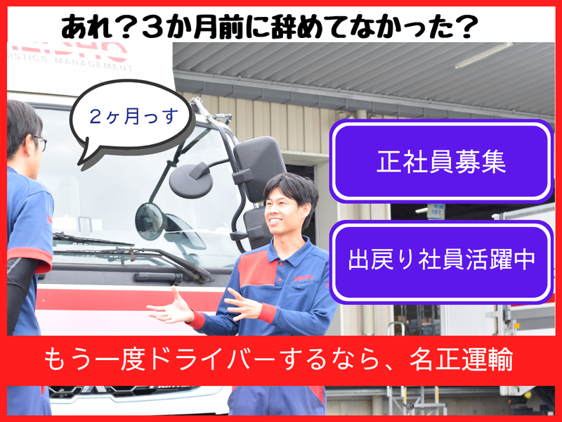 職種/仕事内容 | 仕事内容 ⭐夕方の時間は休み1日より価値がある!?⭐ 現在、交代勤務でツライと思っている方。 完全日勤のドライバー職をしてみませんか ●夜勤なしで生活リズムが安定 ●毎日夕方から自由時間でプライベート充実 ●平日休みも土日休みもシフトによって調整可 ●生活インフラを支える食品輸送 15時には終了する名正運輸のドライバー職。 夕方の時間が豊富にあると どんないいことがあるのか。 ・役所や病院など平日の用事が全部片付く ・家族との生活リズムが同じになる ・趣味がちゃんと続けられる ・家事をまとめて済ませられる つまり、 生活の質が向上するという事です。 【仕事内容について】 お任せするのは、 食品や酒類などの生活必需品を、 大手スーパーや物流センターに 届けるドライバー業務。 配送は1日2〜3便、 1便あたり1〜2件ずつの配送で日帰り。 運行距離も1日100〜200kmと無理のない範囲。 完全日勤かつ定時退勤が基本なので、 家族との時間や生活リズムも大切にできます。 【配送するもの】 スーパー向けの食品や飲料を配送いただきます。 荷物はあらかじめ台車に積まれているので 写真のように台車を押して積み降ろしをします。 パワーゲートというリフトも標準装備のトラックなので 積み降ろしの負担はほとんどありません。 【大まかな1日の流れ】 05:00 出社/点呼・点検・準備 06:00 1便目出発 10:00 2便目出発 14:00 帰社/翌日の準備・終了点呼 15:00 退勤(定時) <⭐実務未経験OK!2ヶ月の安心研修> 車通勤している方ならちょっとの研修と 会社全額負担の免許更新で最短2週間で ドライバ―デビューも可能! ご本人さんが「ひとりで行ける!」と納得するまで 最長2ヶ月間の構内研修や横乗り指導で 丁寧に教えていきますので安心してください。 <⭐休日を最大限楽しむための夕方有効活用> 交代勤務だと洗濯物や家事をついつい溜めてしまいませんか。 せっかくの休みを家事に費やして楽しむこともできない。 平日の夕方が有効活用できれば家事や用事も済ませて 休日には思い切り好きなことができますよ。 <⭐家族との時間を増やして円満な家庭に> お子さんの成長を日々実感できる夕方自由な働き方。 小さい頃は「おかえり」と言って迎えられますし、 キャッチボールや夕飯、お風呂など一緒に過ごす時間を 増やす事ができますよ。 朝はお子さんの寝顔を見て今日も頑張ろうという気持ちで 出社していただけます。 【会社について】 名正運輸株式会社は創業55年以上の歴史がある物流企業です。 大手スーパーや商社などと直接取引があり、 日用品を扱っているため仕事量が安定していることが強み。 2025年4月には子ども手当や安全手当などの強化や 完全週休2日制への統一など働き方や収入の向上を行いました。 基本的にセンター毎に現地採用を行っており、 会社都合での転勤はありません。 勤続年数3年を超えると生命保険の費用補助や 脳ドックの全額負担など、従業員の皆様の健康に対しての 会社からの支援も行っています。 法定順守のドライバー評価取り組みなどに力をいれており、 長く安心して仕事を続けていただける環境を意識しつづけ 国土交通省『働きやすい職場認証』認定も受けました。 |