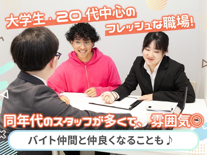 職場環境・雰囲気 | 職場環境 各店舗はスタッフ3〜5名ほどの少人数制。 だからこそ、先輩や社員さんとの 距離が近くてとっても アットホームな雰囲気です! 「困ってもすぐ聞ける」 「自然と名前を覚えてもらえる」 そんな安心感のある環境だから、 バイトデビューの大学生もすぐ馴染めます♪ |