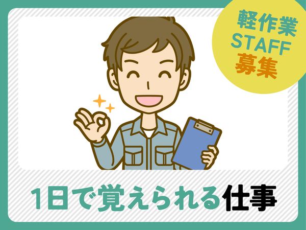 対象となる方 | 応募資格 \こんな方にもオススメ/ 軽作業未経験の方 セカンドキャリアとしてのお仕事をお探しの方 パート・アルバイトのお仕事をお探しの方 フォークリフト免許をお持ちの方 高収入・高時給のお仕事をお探しの方 コンビニ・スーパー・飲食店・ファストフード店での勤務経験を活かしたい方 \こんなお仕事を探されている方にピッタリ/ 商品検品・仕分け・ピッキングなどの倉庫内作業 箱詰め・ラベル貼り・シール貼りなどのコツコツもくもく軽作業 梱包・包装・組立・加工などの工場製造 検査・充填・品出しなどの機械オペレータ 食品工場(肉・鮮魚・野菜・惣菜)での盛り付け・調理・材料カット カンタン作業・ライン作業 |