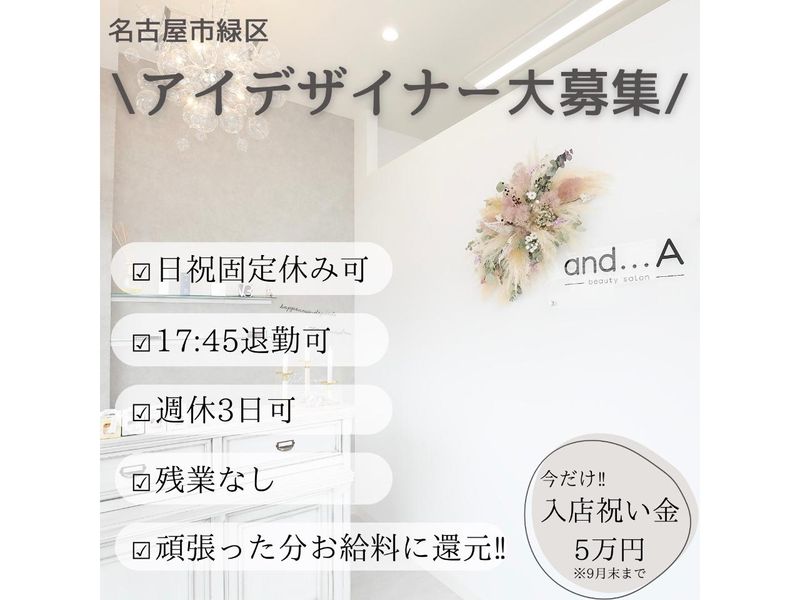 職種/仕事内容 | 仕事内容 << 週休3日制を導入しました♪ >> 最高のサービスを提供するには、 スタッフが”働きやすい”職場を作るところから◎ 「無理をしない働き方」を目指して、環境を整えています。 当サロンでは、しっかりお休みが取れる【週休3日制】を導入! 働き方については、完全週休3日制or完全週休2日制で選べます。 あなたのライフスタイルに合わせて希望を教えてください♪ 「お休みが増える分、給与がすごく低くなっちゃいそう…」 という心配もあるかと思いますが、 安定して稼げる額をしっかりと保証します♪ ▼ お任せするのはこんなお仕事 ▼ まつ毛パーマ・まつ毛エクステ・眉毛スタイリングの施術を メインにお願いします。 慣れてきたら、売り上げ管理や新人教育もお任せ! 最初は先輩スタッフが作業の流れを丁寧に教えます。 施術や接客のマニュアルも完備◎ しっかりとフォローもするので、安心して取り組んでください! 3部屋の小規模で居心地の良い雰囲気が自慢です! 各部屋半個室になっているので、施術に集中できますよ。 *=*=*=*=*=*=*= ◎高歩合であなたの頑張りをしっかりと評価 ◎働き方は選べます! ◎17:45上がりも可能♪ ◎長期連休の取得も可能です! ◎ママさんアイリストも活躍中! ◎残業なし *=*=*=*=*=*=*= 【選べる働き方について】 ライフスタイルに合わせて無理なく働けるよう、働き方の選択もできます◎ ①完全週休3日制+1日10時間の働き方 ・実働10時間 ・月給24万円~(+歩合) ②完全週休3日制+1日8時間の働き方 ・実働8時間 ・月給21万円~(+歩合) ③早番固定+完全週休2日制の働き方 ・実働8時間 ・月給21万円~(+歩合) ※経験者:月給22万円~(+歩合) ④2シフト制+完全週休2日制の働き方 ・実働8時間/2シフト制 ・月給21万円~(+歩合) ※経験者:月給22万円~(+歩合) ※別途で遅番手当、土日祝手当も支給 【当サロンについて】 ご来店されるお客様の9割が地元や近くに住んでいるリピーター様。 20代~50代の女性のお客様が多いです。 少⼈数サロンだからアットホームで働きやすい環境♪ 休憩時間は和気あいあいとお話ししているくらいスタッフ同⼠の仲もいいですよ◎ 技術力はもちろん、接客力にも入れており、学びの時間を取り入れているので アイデザイナーとして確実にスキルアップできます! スタッフが腰を据えて働けるよう、職場の環境を整えています。 お休みもしっかりと取れて、時間の融通が利くので無理のない働き⽅を選べる… 家庭やプライベートも両⽴できる体制です また、ご来店してくださるお客様と同じように働いてくれるスタッフも大切にしています。 予約時間をゆったりと取っているので焦ることなく丁寧な技術、接客サービスができます! 回転重視ではないのでしっかりお客様に寄り添うことができますよ。 「趣味の時間をしっかりと確保したい」 「無理のない働き方がしたい」 「地元で経験を活かせる仕事をしたい」 …など、働くきっかけは何でもOKです◎ <事業内容>アイサロン |