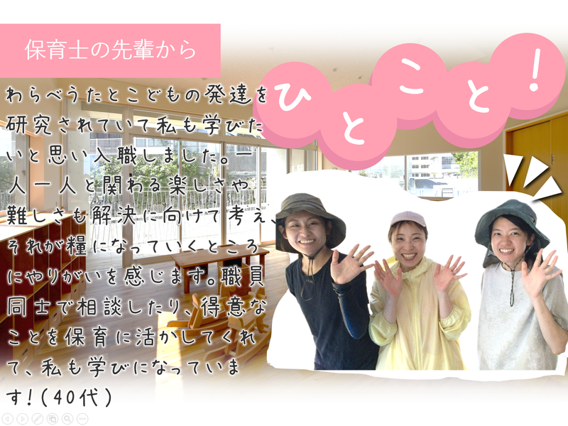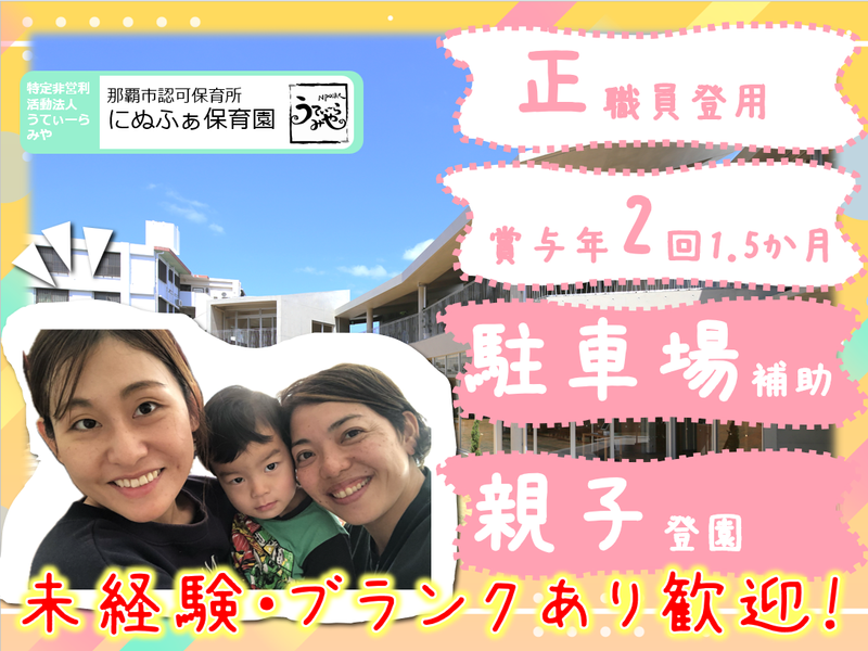 職種/仕事内容 | 仕事内容 0歳児~5歳児クラス、園児定員70名在籍。 保育士として勤務、朝のお集り、お散歩・プール・園庭遊びなどの保育活動実施、保育記録をとり保護者と育ちの連携を行います。 医師、保育士、早期発達支援士、栄養士・調理師、看護師が合計30名勤務、互いの専門性を活かしながらサポートし合います。 当園では職員の業務負担を減らすため、保護者連絡・園児の登降園記録・午睡センサー安全管理のシステムを導入し連絡帳や記録の時間を短縮し、業務改善に取り組んでいます。 また年間行事を見直し制作物をなくし写真アルバムをシステム化し、よりこどもと向き合う時間を確保できるよう工夫しています。 多様な子どもたちと積極的に対話し個々の発達課題を保育士・保護者・お台所職員・病児病後児室職員と連携しながら、お互いの良さを尊重し合える保育に関わりたいと考える保育士を募集いたします。 那覇市認可保育園で安定して勤務できます。 子どもたちと暮らしを共にしお互いが育ちあう保育を目指しともに暮らしを創造してします。 初年度契約職員、次年度以降正規職員へ登用。 |
