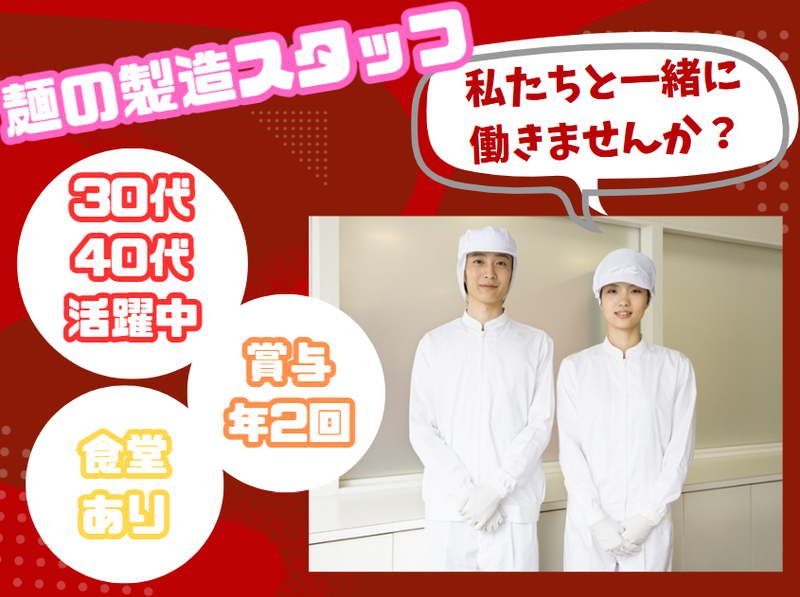 職種/仕事内容 | 仕事内容 あなたが製造した麺は 大手有名チェーン店へと配送され 美味しい料理となり たくさんの方たちの 笑顔へと繋がっていきます。 未経験から始められる やりがい抜群のお仕事。 30代~40代が活躍中。 今回販路拡大の為、増員募集致します。 麺・惣菜の製造のお仕事をお任せします。 他にもアルバイトスタッフの管理や指示出しなど。 基本的にはコツコツ・モクモクと お仕事に取り組む事が可能です。 実際に行っていく 下記の工程は、2人1組で行っていきます。 ⭐仕事の流れ⭐ - 生地の切り出し ↓ 麺の整形 ↓ 蒸し作業 ↓ グラム調整 ↓ 冷却 ↓ 包装 - まずは基本的な業務を覚えることからスタート。 お仕事に慣れてきたらアルバイトへの指示出しなど できることを増やしていきましょう。 未経験からでもしっかりサポートしますので 安心して下さいね。 / あなたももしかしたら食べたことが あるかもしれないほどの 大手チェーン店へ麺をお届けしています!! \ 食という観点から、人々の生活を サポートしているとも言えるお仕事。 社会貢献度も高く、大きなやりがいがあります。 先輩たちの中にも未経験から スタートした方はたくさんいます。 あなたも同じようにしっかり サポートするのでご安心ください。 いきなり全てできる必要はありません。 少しずつできることを増やしていければOKです。 |