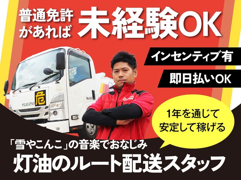 職種/仕事内容 | 仕事内容 お客様のご自宅に灯油をお届け! 決まったルートを巡回するので、 全く難しくありません。 「ありがとう」や「待ってたよ」などの嬉しいお言葉を直接聞けることもこのお仕事のやりがいの1つです! <1日の流れ(例)> 出社 ▼ 準備 ▼ 巡回(販売数に応じてインセン獲得♪) ▼ 休憩 ▼ 帰社・精算 ・。'.・。'.・。'.・。'.・。'.・。' <おすすめポイント> ✅未経験者OK スタッフの大半は未経験からのスタート、必要なのは普通免許だけ。しっかりと研修をおこなうのでご安心ください。 ✅日払いOK、インセンティブあり 即日払いOK・販売数によりインセンティブ有!と稼ぎたい方必見の充実制度をご用意! ✅1年を通じて勤務可 灯油の販売は冬季だけですが、幅広く仕事を請け負っている企業なので一年を通じて勤務が可能です。 ・。'.・。'.・。'.・。'.・。'.・。' |