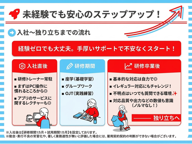 試用期間 | 試用期間あり 試用・研修期間:15~17日 試用・研修期間の条件:本採用と同じ ※研修期間の最初の1週間(5日間)のみ09:50~18:50の 週5日勤務をお願いしております。 一部出勤不可など、日程の相談はOK♪ ※時短勤務などは研修終了後 からご相談可能です。 ※日数は業務内容によって 変動することがあります。 |