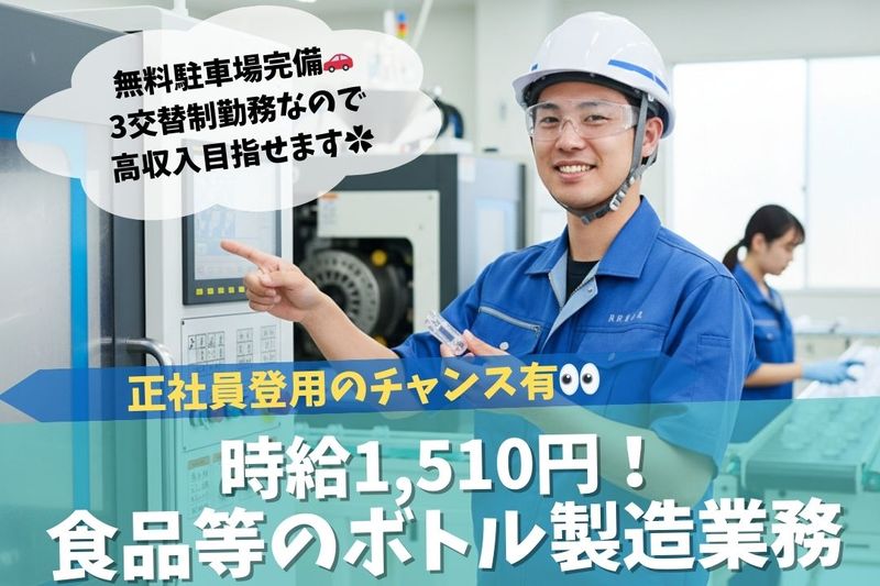 職種/仕事内容 | 仕事の内容 \✨未経験OK!ペットボトル・調味料ボトル製造オペレーター✨/ 高時給1,510円!未経験から製造現場のスキルを身につけ、しっかり稼げるチャンスです。 【具体的な業務内容】 ◆成型機のオペレーター業務 プラスチック製品の成型機の簡単な操作を行います。 ボタン操作や設定確認など、基本はマニュアルに沿った作業です。 ◆生産トラブル対応 製品の詰まりやエラー表示など、軽微なトラブルの一次対応を行います。 対応方法は決まっているため、徐々に覚えていけます。 ◆品質確認・不良品処理 出来上がった製品の外観チェックを行い、不良品の仕分けを行います。 ◆段取り替え作業 製品切替時に金型や設定の変更などを行います。 手順書があるので安心です。 ◆機械のメンテナンス・清掃 作業終了後の簡単な清掃や、日常点検を行います。 ◆生産記録の記入 数量や作業内容を帳票へ記入します(数字記入中心)。 【✨ココが魅力!✨】 ✅高時給1,510円!未経験でもしっかり稼げる ✅3交替制で月収30万円以上も可能 ✅残業ありでさらに収入アップを目指せる ✅生産現場でのスキル習得&キャリアアップ ✅やる気次第で正社員登用のチャンスあり ✅社会保険完備 ✅交通費支給(規定あり) ✅制服貸与 ✅有給休暇制度あり ✅週払い・前払い制度あり ✅車・バイク・自転車通勤OK(無料駐車場完備) 【こんな方におすすめ】 ・未経験から製造現場にチャレンジしたい方 ・スキルアップ、キャリアアップを目指したい方 ・しっかり働いてしっかり稼ぎたい方 ・安定した環境で長期的に働きたい方 |
