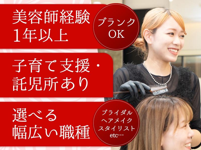 職種/仕事内容 | 仕事内容 ✨ブランクあり・アシスタント経験のみの方も大歓迎!✨ 『実務はアシスタント経験だけ…』 『美容師を辞めてからブランクがある…』 そんな実務経験の浅い方やブランクのある方も大歓迎です! 不安な方もご安心ください。 まずはカラーからスタートして、ゆくゆくはカットも挑戦したい、といった働き方もOKです。 ✅ 美容師経験1年以上であればOK! ✅ スキルアップや活躍の場を広げたい方にピッタリ! ✅ ブランクOK!産後復帰の方や子育てがひと段落した方活躍中! ✅正社員登用制度あり!ゆくゆくは社員を見据えた勤務も歓迎! <業務内容> ━━━━━━━━━━━━━ お客様の案内・準備 カラー剤の調合 カラー剤の塗布 片付け・清掃 など ◇業務の幅を広げるチャンスです! 実務経験がアシスタントのみの方や、ブランクのある方も大歓迎です。 せっかくの美容師免許をそのままにしておくのはもったいないですよ! サロン勤務をされている方で、より専門的な職種への転職を考えている方も大歓迎です! <働きやすい職場です> ━━━━━━━━━━━━━ ライフスタイルを尊重します! ✅子育てサポートもあり、無理なく復帰していただくことが可能です ✅長期ブランクからの復帰支援制度あり |