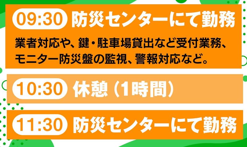 勤務時間 | シフト制 勤務時間詳細 実働時間:1日あたり8時間 平均勤務日数:1ヶ月あたり8日 〜 10日 【 勤務時間 】  ̄ ̄ ̄ ̄ ̄ ̄ ̄ ̄ ✨歩行者等通行安全管理・場内の車両整理  ̄ ̄ ̄ ̄ ̄ ̄ ̄ ̄ ̄ ̄ ̄ ̄ ̄ ̄ ̄ ̄ ̄ ̄ ̄ ̄ ✅07:30~16:00 ※実働7.5時間/休憩1時間 ⏩日給10875円 ※週1日からOK ━━━━━━━━━━━━━━━━━━━━ ★勤怠管理システムで労働時間を管理! 長時間労働を可能な限りなくすべく、 会社としても取り組んでいます。 ━━━━━━━━━━━━━━━━━━━━ |