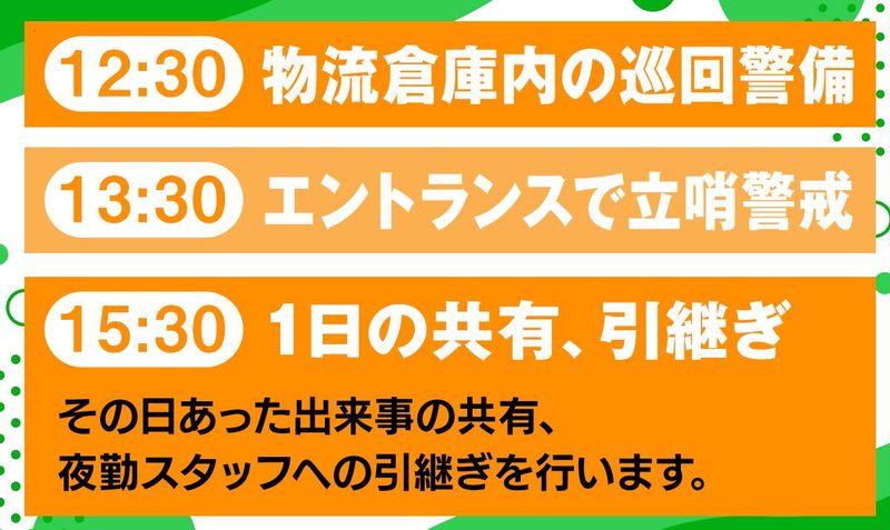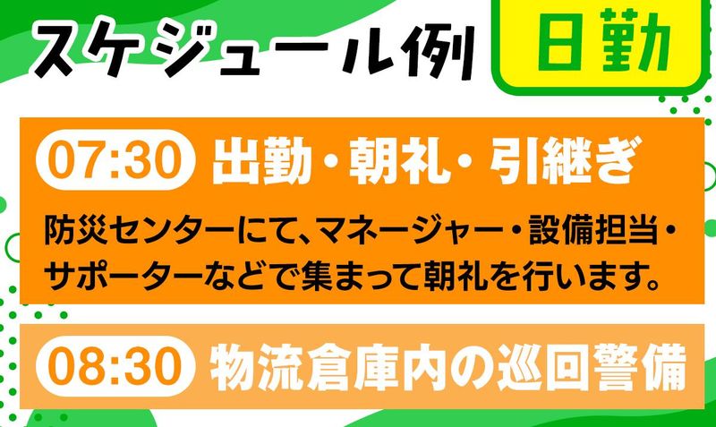 職種/仕事内容 | 仕事内容 ▼+。 求人の『ココ』に注目! 。+▼  ̄ ̄ ̄ ̄ ̄ ̄ ̄ ̄ ̄ ̄ ̄ ̄ ̄ ̄ ̄ ̄ ̄ ̄ ̄ ̄ ◎+…50代~60代の方が多数活躍中…+◎ < 未経験スタートも大歓迎!! > ...・*・.・*・.・*・.・*・..・*・.・*・... ✅スタッフは人柄も良く世話好きな方も◎! 快適で居心地の良い環境です!! ✅土日祝&年末年始だけのお仕事です! 副業・Wワークとして働く方も♪ ✅勤務地は固定!腰を据えて長く働ける! ✅車・バイク通勤OK!無料送迎バスも有! ✅チーム制勤務で、未経験でも安心! ✅まだまだ現役のシルバー世代も活躍中! ✅電話応募も歓迎!お気軽にお電話ください♪ 【03-6479-0579】 ━━━━━━━━━━━━━━━━━━━━ 【 お仕事内容 】  ̄ ̄ ̄ ̄ ̄ ̄ ̄ ̄ ̄ 倉庫内において、 ▼施設内の各種防災・防犯監視盤の監視 ▼モニター監視 ▼巡回 ▼立哨 ※一定の場所での監視・警戒業務 ▼門扉開閉業務 などの警備業務をお任せします。 ★現在活躍中のスタッフの皆さんは、 思いやりがあり、親切な方ばかり! フラットで働きやすく快適!! 従業員の定着率も高いので、 今回久しぶりのスタッフ募集です♪ ━━━━━━━━━━━━━━━━━━━━ < ミドル・シニア世代活躍中! >  ̄ ̄ ̄ ̄ ̄ ̄ ̄ ̄ ̄ ̄ ̄ ̄ ̄ ̄ ̄ ̄ ̄ 未経験でも日給2万円以上で、 安定した収入が得られます。 退職後のセカンドキャリアや、 サードキャリアでの挑戦にもピッタリです! 土日祝メインのお仕事なので、 『家庭と両立して働きたい!』という方や、 家族のお世話や介護との両立も可能です! 地域社会に貢献し、人との交流も深められます。 適度に体を動かすこともできるので、 シルバー世代の健康づくりにも繋がり、 セカンドライフの充実度も高まります◎‼ 『健康の維持』や『新しい人とのつながり』 『かわいい孫へのお小遣い』『推し活』など 「定年を過ぎても現役で頑張りたい!」という シニア世代の方々も多数活躍中です♪ ・・・・・・・・・・・・・・・・・・・・ < 新しい事への挑戦を全力応援! >  ̄ ̄ ̄ ̄ ̄ ̄ ̄ ̄ ̄ ̄ ̄ ̄ ̄ ̄ ̄ ̄ ̄ ̄ 業務に必要なノウハウや、 仕事の基本的な流れに関しては、 入社後にひとつ一つ丁寧に しっかりとお教えします!! 防犯設備などに、実際に触れながら きちんと学べる3日間の研修もご用意! また、業務はチームで行うので、 分からないことはすぐに質問できるので 未経験の方でも安心して始められます! ・・・・・・・・・・・・・・・・・・・・ <勤続10年超えが約4割!定着率抜群◎>  ̄ ̄ ̄ ̄ ̄ ̄ ̄ ̄ ̄ ̄ ̄ ̄ ̄ ̄ ̄ ̄ ̄ ̄ ̄ 「ユニティを選んで良かった。」 一人でも多くのスタッフにそう思って もらえるように、”感謝の気持ち”が 飛び交う職場づくりに取り組んできました。 長く頑張ってくれるスタッフの多さは、 会社として大きな誇りです。 今後も、みんながイキイキ活躍できる 環境を整えていきたいと思っています。 ━━━━━━━━━━━━━━━━━━━━ 【 活躍中のスタッフの声 】  ̄ ̄ ̄ ̄ ̄ ̄ ̄ ̄ ̄ ̄ ̄ ̄ ̄ ̄ 『定年退職後、まだまだあふれる気力を 持て余しながら生活していました。 家内が「こんな仕事があるみたいよ」と 見せてくれた求人広告をみて、 これだ!と思いました。 人生100年時代、夫婦で生きていくために 貯蓄はいくらあってもいいですからね! 可愛い孫の成長を見るためにも、 まだまだ頑張っていこうと思っています!』 <入社15年目/男性・60代> ━━━━━━━━━━━━━━━━━━━━ |
