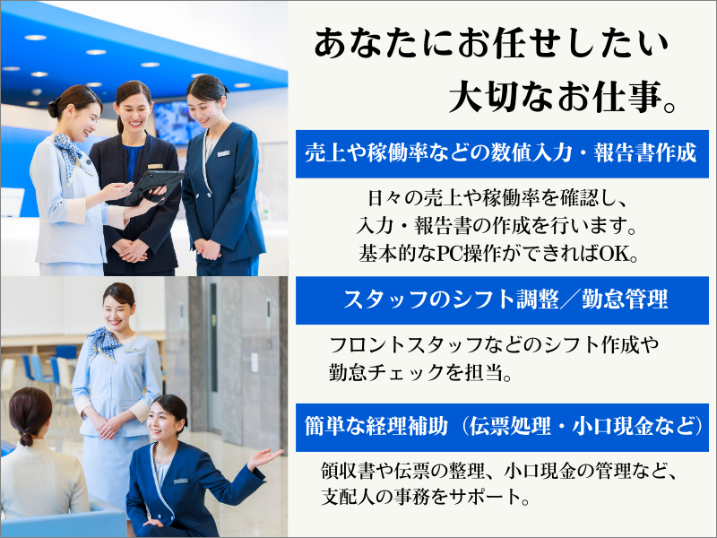 職種/仕事内容 | 仕事内容 \\\“働きやすさ”って、こういうこと。/// ⏩通勤ラッシュを避けて、朝はゆっくり10:30出社 ⏩毎週固定休(日・月・祝日)でライフワークバランス◎ ⏩有給取得率100%/年間休日120日以上 ⏩残業は少なめ 働きやすさとやりがいを両立できる ホテルの運営をサポートする“縁の下の力持ち”として、 支配人の右腕になりませんか?  ̄ ̄ ̄ ̄ ̄ ̄ ̄ ̄ ̄ ̄ ̄ ̄ ̄ ̄ ̄ ̄ ̄ ̄ ̄ ̄ ̄ ̄ \あなたの“社会人経験”、今度は運営の支えに/ 「接客は好きだけど、前に立つより誰かを支えたい」 「社会人経験が長いからこそ、役に立てるはず」 ――そんな30~40代のあなたに、ぴったりの仕事です。 ▼主な業務内容 支配人補佐として、ホテル運営を“裏側から”支えます。 ・スタッフのシフト調整/勤怠管理 ・備品の在庫管理・発注 ・売上や稼働率などの数値入力・報告書作成 ・清掃やフロントスタッフとの情報連携 ・支配人の業務サポート(事務・報告書など) ・簡単な経理補助(伝票処理・小口現金など) \直接接客しなくても、現場に欠かせない存在になれます。/  ̄ ̄ ̄ ̄ ̄ ̄ ̄ ̄ ̄ ̄ ̄ ̄ ̄ ̄ ̄ ̄ ̄ ̄ ̄ ̄ ̄ ̄ ╭━━━━━━━━━━━━━━━━━━━╮ ⭐経験を重ねた今だからこそ、できる仕事 ⭐ ╰━━━━━━━━━━━━━━━━━━━╯ この仕事で大切なのは、 周囲を見ながら気を配ったり、スムーズに調整したりする力。 それは、社会人経験を重ねた今のあなたの方が、 ずっと自然にできるはずです。 例えば・・・ ✅ 一般事務での書類作成やデータ管理 → 数値管理や支配人補佐業務に活かせる ✅ 医療・施設受付での状況把握と対応 → スタッフの調整・現場との連携で強みを発揮できる ✅ 経理や伝票処理の経験 → 経理補助・書類作成業務の即戦力になります! 「いつの間にか、周りに頼られるようになっていた」 「現場の雰囲気を見て、先回りして動ける」 そんな“社会人力”が、まさに活きるポジションです ╭━━━━━━━━━━━━━━━━━━━━━━╮ ⭐ “ちゃんと働く、ちゃんと休む。”が叶います。 ⭐ ╰━━━━━━━━━━━━━━━━━━━━━━╯ 日曜・月曜・祝日が固定休。 朝は10:30出社だから、通勤ラッシュも無縁。 残業も少なく、有給も取りやすい。 だからこそ、仕事に集中できるし、私生活も大切にできる。 「仕事がハードすぎて、生活が崩れる」 そんな働き方を変えたい方に選ばれている環境です。 |