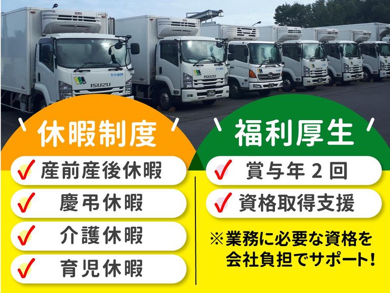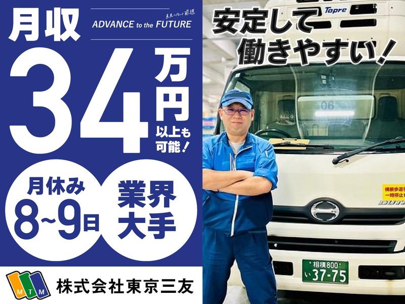 職種/仕事内容 | 仕事内容 ━━━━━━━━━━━━━━━━━━━━ >>この求人のポイント - ✅安定志向の方に!大手の安定基盤あり ✅月8~9日休み!家族時間も充実OK ✅連休OKの固定曜日!有休も取りやすい! ✅賞与年2回、手当や資格支援など高待遇 ✅30代~50代の男女ドライバー活躍中! ✅ご希望のキャリア形成を応援します! ━━━━━━━━━━━━━━━━━━━━ 【仕事内容】 3tトラックで主にチルド商品を 大手コンビニへ配送していただきます。 《配送に関して》 ■配送エリア:神奈川県・東京都内 ■1日の配送件数:12件 ■積卸方法:バラ積み、バラ降ろし └※オリコンでの納品となります ■乗車車両:3t └ コースによって 車格が変わる可能性があります。 《手積み・手降ろしはほぼなし》 配送先店舗での積み下ろしは 店舗備え付けの台車に荷物を積み、 指定の場所まで運搬。 その後、次の配送先まで移動します。 《配送以外の業務はほぼなし》 車の整備などは全て外注しているので、 日常点検程度はありますが、 配送業務に集中することができます! - ▼1日の流れ 06:00 - 出勤、アルコールチェック及び点呼 07:00 - 積込し、配送スタート ┗※6時間で1回転(12件) 17:30 - 帰社して報告作業やアルコールチェック、点呼 18:00 - 退勤・お疲れ様でした! - ▼入社後について 入社後、2週間~1ヶ月程度の研修あり! 同乗研修や商品の置き方・積み方など 業務の流れを学んでから業務開始できます! - / 当社で働く嬉しいメリットをご紹介! \ ◆1.大手だからこその安定性  ̄ ̄ ̄ ̄ ̄ ̄ ̄ ̄ ̄ ̄ ̄ ̄ ̄ ̄ ̄ ̄ 当社は業界大手の「三友通商」のグループ会社。 「冷蔵・冷凍配送なら三友」と言われるほど 業界内でも高い知名度を誇っています。 全国各地に50拠点以上を展開し、 社員数はグループ全体で1700名以上! 200社以上の協力企業と連携をとりながら 物流ネットワークサービスを提供しています。 <HP>https://mitomo-tusyo.co.jp/ ◆2.勤務体制・福利厚生も充実  ̄ ̄ ̄ ̄ ̄ ̄ ̄ ̄ ̄ ̄ ̄ ̄ ̄ ̄ ̄ ̄ 月の休みは8~9日。 連休も相談OKの固定曜日シフト制 &有休が取得しやすい風土だから 負担なく安心して働ける環境です! 実際に 毎週「日曜・月曜休み」や 「水曜・木曜休み」などの 連休シフトで働いている スタッフもいますし、 繁忙期などを避ければ 基本的に有休は取得できるので、 「疲れが溜まってきたから休みたい」 「家族と旅行に行きたいな」と思ったら 固定休+有休で3連休や4連休も可能! ワークライフバランスを大切にしながら メリハリをもって働けます! ◆3.福利厚生も充実  ̄ ̄ ̄ ̄ ̄ ̄ ̄ ̄ ̄ ̄ ̄ ̄ ̄ ̄ ̄ ̄ 平均月収34万円のほか、 年2回の賞与や各種手当も整っているので 頑張りに応じた報酬をしっかりと 受け取りながら高収入を目指せます! また、希望者は自動車学校に通い 大型免許を取得していただくことも可能! スキルアップもしっかりサポートします! ◆4.キャリア形成もバッチリ  ̄ ̄ ̄ ̄ ̄ ̄ ̄ ̄ ̄ ̄ ̄ ̄ ̄ ̄ ̄ ̄ 仕事を進めていく中で、 将来はドライバーを極めるも良し、 運行管理にチャレンジするも良し、 所長などの役職や管理部門への配属など ステップアップを目指すも良し! その都度一緒に相談しながら、 理想のキャリアを築いてください◎ |