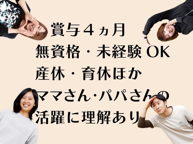 待遇・福利厚生 | 【保険制度】 雇用保険、労災保険、健康保険、厚生年金 【福利厚生】 待遇・福利厚生 【福利厚生】 【福利厚生】 ・処遇改善一時金(3月/8万円) ・交通費規定支給(3万円まで/月) ・退職金制度 ・私服OK ・社員旅行あり 【各種手当】 ・時間外手当 ・宿泊手当 ・出張手当 ・役職手当 ・職能手当 ・家族手当 ・住宅手当 ・職能手当 ・管理職手当 ・資格取得支援制度 ・報奨金あり(資格取得時/1万円支給) その他 ◆階層に応じた研修制度を豊富に用意。着実なキャリアアップを実現できます。 ・新人研修 ・リーダー研修 ・5年目研修 ・10年目研修 ・中堅研修 ・管理者研修 ・他、様々な外部研修あり |
