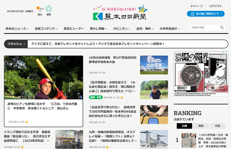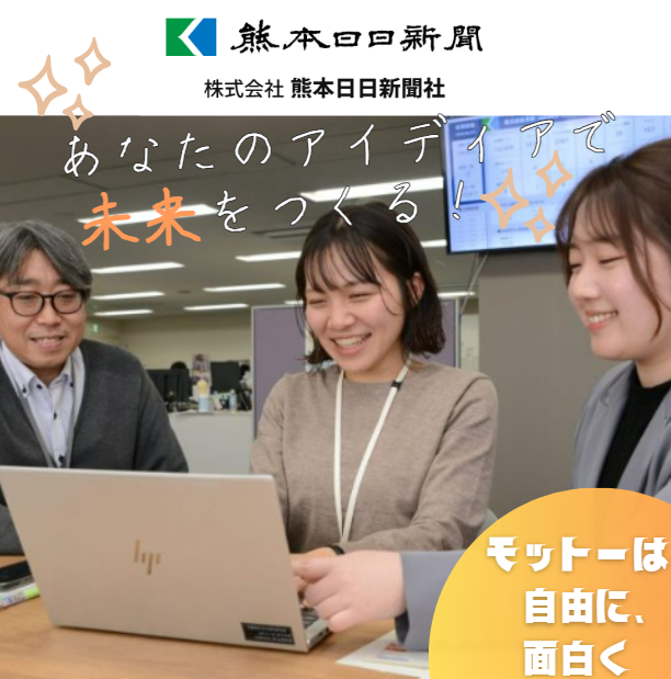 職種/仕事内容 | 仕事内容 \\アピールポイント// ⭐月給 27万5,505円 ~ ⭐賞与年5ヶ月分支給! ⭐フレックスタイム制♪ ※コアタイム無し! ⭐基本的に毎週土日休み♪ ※年に数回イベントで土日出勤有(振り替え休日有) ⭐毎年11日連続のリフレッシュ休暇あり ▼∴▼∴▼∴▼∴▼∴▼∴▼∴▼∴▼∴▼∴ ✨あなたの色で熊日に新しい風を✨ 「地元で働きたいけど、 刺激がないのは嫌だ」 「自分のアイデアが、 誰かに届く仕事がしたい」 そんな風に考えている人、大歓迎! 私たちは、熊本の老舗新聞社 「熊本日日新聞社」の デジタルメディア「熊日電子版」の仲間を 探しています♪ マニュアル通りの仕事ではなく、 あなたのアイデアやWebスキルを 活かして、新しいコンテンツを 企画したり、Webサイトを 使いやすく改善したり、 『自由に、面白く』をモットーに、 熊本の未来を一緒に創っていきましょう! ▼∴▼∴▼∴▼∴▼∴▼∴▼∴▼∴▼∴▼∴ ✨お仕事内容✨  ̄ ̄ ̄ ̄ ̄ ̄ ̄ ̄ ̄ ̄ ̄ ̄ ̄ ̄ ̄ ̄ ̄ ̄ ̄ ✅自由な発想でWebサイトを創る 「熊日電子版」の運用・改修業務から、 アクセスデータの分析、さらには会員を 増やすためのプロモーション企画まで、 幅広くお任せします♪ 「こんな記事があったら読みたい」 「この機能をつけたら便利そう」 といった、あなたのアイデアが そのまま形になります! ✅スキルアップも全力サポート 「CMS」や「MAツール」など、 Web運営に必要な知識やツールの 使い方は、先輩社員がイチから 丁寧に教えます! あなたのレベルに合わせて、 着実にスキルを磨ける環境です♪ 将来的には、プロジェクトマネージャー やメディア戦略担当などへの ステップアップも可能♪ エンジニアやプログラマー、WEBデザイン などのITスキルをお持ちでもっともっと、 自分のキャリアを磨きたい方にオススメ! スキルを磨く最高の場をご提供します! ✨ホームページ✨  ̄ ̄ ̄ ̄ ̄ ̄ ̄ ̄ ̄ ̄ ̄ ̄ ̄ ̄ ̄ ̄ ̄ ̄ ̄ 当社について、もっと知りたい方、 ぜひホームページも検索してみて下さい♪ https://corporate.kumanichi.com/ |