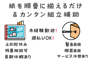 職種/仕事内容 | 募集背景 ビジネス拡大による人員増強のため 仕事内容 未経験OK! 週払いOK 紙を順番に揃えるだけ&カンタン組立補助 お仕事内容は 保管、輸送、荷役、包装、流通加工を行っている物流倉庫での、 かんたんな軽作業です。 番号のついた紙を順番に並べて資料を作ったり、 組立ラックの連結部品を組み立てたりと、 軽い物ばかり、かんたんな作業がほとんどです。 新しくキレイな倉庫で、冷暖房完備ですので、季節関係なく 快適にお仕事していただけます。 アットホームな雰囲気の職場で未経験の方・ブランクのある方でも 丁寧に教えますので、心配いりません。 すぐに慣れていただけますよ! 担当者がしっかりフォローいたしますのでどんな事でもご相談ください。 まずはご応募をお待ちしております。 [こんな人が活躍] 株式会社Rian Japanは、物流を中心に人材派遣・紹介を行う総合人材サービス会社です。 未経験から始められる仕分けやフォークリフト作業、現場管理など幅広い職種を募集しています。 |