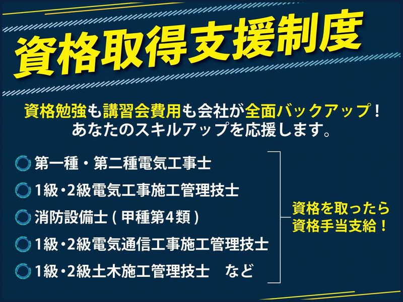 職種/仕事内容 | 仕事内容 \\ 現場への直行直帰OK! // 【未経験OK!年齢不問!稼ぎたい方に!】 「家を買ったので稼げる仕事がしたい」 「知識はないけど電気工事に興味がある」 「現在の収入に不満がある」 「一人親方から、会社に所属したい」 …そんな方にオススメです。 他業種からの転職も大歓迎、電気のことは 何も知らなくてOK。資格も当社で取れます  ̄ ̄ ̄ ̄ ̄ ̄ ̄ ̄ ̄ ̄ ̄ ̄ ̄ ̄ ̄ ̄ ̄ ̄ ̄ ̄ 【こんな会社です】 業界内ではかなり大きな規模の会社です。 施工力の高さで厚い信頼をいただいていて、 超大手の商業施設、病院、工場、物流倉庫、 スポーツ施設、官公庁からの依頼も多数有! 1日稼働人数が150名にも達し、納期が近い 現場へもヘルプ要員を余裕で送り込める 体力を持った会社です。  ̄ ̄ ̄ ̄ ̄ ̄ ̄ ̄ ̄ ̄ ̄ ̄ ̄ ̄ ̄ ̄ ̄ ̄ ̄ ̄ 【お仕事内容】 東毛地区エリアの現場での電気工事です。 ●未経験者・まだ経験の浅い方は… まずは頼れる先輩とマンツーマンで、 イチから仕事のやり方をレクチャーします 1人で作業させる、なんてことは 絶対しないので安心して下さい! ●経験者は… あなたのスキルに合った作業を担当して いただきます。1人でやる仕事でも、 コンビを組んでやる仕事でも、複数人の 仕事でも、希望は何でもご相談下さい。 もちろん任せきりにはいたしません! フォロー体制は万全なのでご安心を。 ※現場へは直行直帰OKです。 作業が終わったらサクッと帰宅できます!  ̄ ̄ ̄ ̄ ̄ ̄ ̄ ̄ ̄ ̄ ̄ ̄ ̄ ̄ ̄ ̄ ̄ ̄ ̄ ̄ 【資格取得支援制度あり】 〇第一種・第二種電気工事士 〇1級・2級電気工事施工管理技士 〇消防設備士(甲種第4類) 〇1級・2級電気通信工事施工管理技士 〇1級・2級土木施工管理技士 など 資格を取るための勉強はもちろん、 講習会費用なども会社が全面バックアップ。 有資格者になれば資格手当を支給します! |