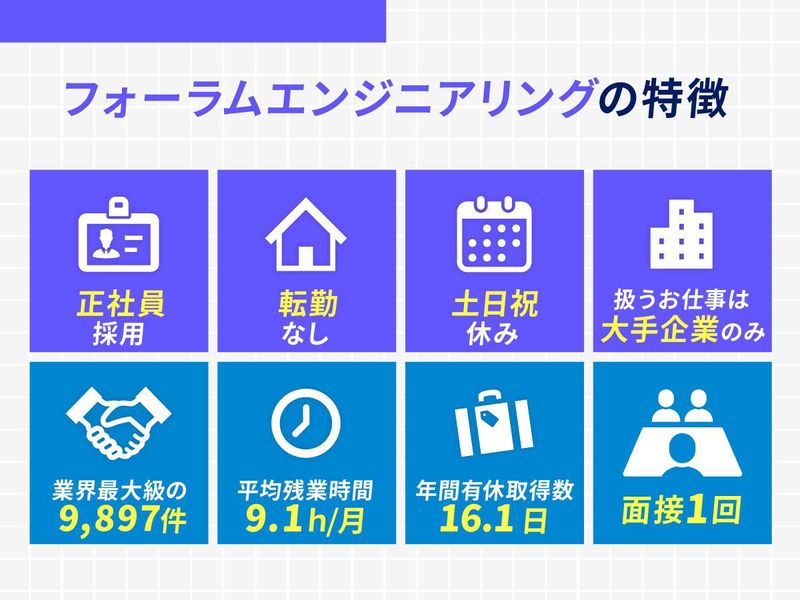 職種/仕事内容 | 仕事内容 ■―――――――――――――■ 面接1回のスピード選考実施中! 2月入社大歓迎! ■―――――――――――――■ ◆経験者月給35万円~ ◆月平均残業時間9.1h ◆入社後も転勤なし 【業務内容】 ・生産計画の立案 ・納期管理、原価管理、工程管理、部品選定 ・コスト管理、発注業務 ・報告書作成(Word、Excel使用) 【正社員(無期雇用派遣)・賞与あり】 当社の正社員として入社いただいたうえで、大手メーカーをはじめとするプロジェクトに従事していただきます。 一般的な登録型派遣とは異なり、「正社員型派遣」となるため、雇用期間に期限はありません。 派遣期間以外でも給与は保障されますし、賞与も支給されます。 <こんな方にも無期雇用派遣がお勧めです> ・様々な製品に携わりながらエンジニアスキルを向上させたい ・柔軟にエンジニアキャリアを形成したい ・将来を見据えてエンジニアとしてできる幅を広げていきたい ・安定して正社員で働きたいが、職場環境が合うか不安 ・一つの企業に縛られることなく、色々な会社で働いてみたい ※週5日勤務/実働8時間での募集となります。 【フォーラムエンジニアリングの魅力】 ■平均有休取得日数16.1日/年 推しのライブ・旅行・平日のレジャーなど、 趣味や家族との時間を充実させている社員も多数! ■ 土日休み・平均残業時間9.1h/月 完全週休2日(土日祝休み)で、残業も少なめ、 プライベートの時間も確保できる環境です。 ■ 転籍実績:年間100名以上 プロジェクト先の大手メーカーへ正社員として転籍するチャンスも多数あります。 ■ 年間プロジェクト数:9,897件 業界最大級の案件数の中から、あなたに最適なプロジェクトをご紹介します。 キャリアや希望に関するご相談もお気軽にどうぞ! ■ 入社後も転勤なし 好きな場所、馴染みのある土地で、長く安心して働けます。 |