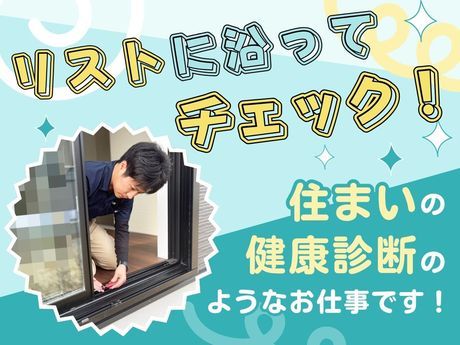職種/仕事内容 | 仕事内容 ■ ■ ■ お客様に喜ばれる♪接客のようなお仕事 ■ ■ ■ マイホームを購入されたお客様の アフターサービスとしての住宅点検のお仕事です。 住まいに関するお困りごとや不具合を お聞かせいただき、 アドバイスすることもあったりと、 お客様とのコミュニケーションが楽しいお仕事♪ お手入れ方法やお掃除テクニックなど 研修や実践で学んだことをお伝えして お客様に喜んでいただける… 接客がスキ、人と話すことがスキな方には 結構楽しいお仕事だと思います◎ ■ ■ ■1日の流れ・お仕事の様子■ ■ ■ 未経験でもできる『住まいの健康診断』! 例えば、「壁にヒビが入っていないか」「扉の不具合(目視)確認」 「雨漏りの跡はないか」「床が傾いていないか」などをチェック。 1.事前にアポイント予約済みのお客様宅にご訪問 (専門部署があるため、ご自身でのアポイント取得活動はございません。) ↓ 2.住み心地のヒアリング! お住まいに関するお悩みやお手入れ方法の相談に乗ったりもします ↓ 3.チェックリストに沿って点検! ↓ 4.完了のサインをいただいて、「ありがとうございました!」 点検作業完了! 他、建具のネジ締めなど、簡単な調整を行うこともあります。 あくまでアフターフォローの役割なので、 お客様に安心して住み続けていただけるよう、 丁寧に対応ができれば大丈夫です! ノルマや営業行為などは一切ありません。 / 【職場の雰囲気は 】 ☆20代~30代が中心となって活躍中 ☆若手の育成実績多数あり! 社会人経験がなくてもしっかり 教育する体制が整っています♪ \ ■ ■ ■未経験入社はなんと9割以上!!■ ■ ■ ご自宅から直行直帰OK!! 1日2~3件ほどの訪問となりますので、 車での移動時間が長めになります。 休憩も比較的細かく取得でき、 のびのびとお仕事が出来ます。 独り立ち後は、1人で業務を担当するので、 移動時間とご訪問のオンオフを切り替えながら リフレッシュしながら仕事ができると評判です♪ ★分からないことは都度先輩社員に聞ける体制あり!★ ■ ■ ■「仕事のON OFFしっかり」「シフト制で働きやすい」…☆■ ■ ■ 仕事のON OFFがしっかりしているので、 退勤後に「あれやらなきゃ..」「この作業しなくちゃ..」 などあれやこれやと考えることはありません! 退勤後は直帰で空いた時間にジムにいったり♪ 趣味に時間を使ったり♪帰り道にお買い物したりみんなそれぞれ! 完全週休2日制のシフトなので「この日は推し活♪」「ライブがあるから!」 「平日しか開催していないイベントに行きたい!」「子供の行事で」等々 希望休が取りやすい勤務で仕事ができます♪ プライベート重視で働いている社員も多数在籍! ■ ■ ■入社後の流れと万全のサポート体制■ ■ ■ 【入社後の流れをご紹介】 ●初めは座学研修で専門知識を習得! 用語や道具などは座学でじっくり覚えられます! ↓ ●先輩スタッフと同行してスキルを習得! マンツーマン形式で行われるため、 不安や疑問はすぐ解決できます! ↓ ●独り立ち!(入社~約1ヶ月) 【キャリアアップで安定勤務可能!】 適性と希望により、正社員登用制度もあります! 登用試験は年2回実施され、 適性試験や面談を行い、 合格すれば正社員になれます! |