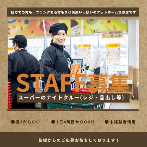 職種/仕事内容 | 募集要項 職種 スーパーのナイトクルー(レジ・品出し等) 雇用形態 アルバイト 仕事内容 レジでの精算・接客及びパック詰め、品出し、整理など 【具体的には】 <レジ業務> 商品購入の際のレジ業務をメインに行なっていただきます。 商品をお客様が袋詰めしやすいようにスキャンしたり、 スキャンするスピードを早くしたり、意外と奥が深い仕事です。 <品出し業務> 毎日入荷されてくる冷蔵商品や、調味料・食品等の商品補充(品出しのサポート程度)を していただきます。 売れ行きに応じて商品の補充をお願いします。 まずは売り場の場所を覚えるところからスタートするので未経験の方も ご安心ください。 今いるスタッフも初めは短期や単発でのアルバイトを探していたけど、 長期的に働いてくれているほど毎日新鮮な気持ちで働ける環境です。 未経験から始めた先輩がたくさんいて一緒にサポートしますので未経験の方も ご安心ください。 |