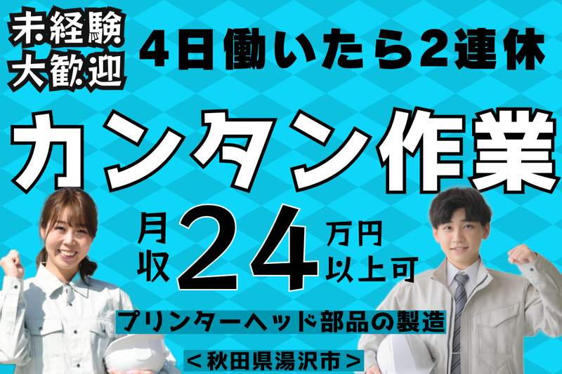 職種/仕事内容 | 仕事内容 《 ここがポイント! 》 ●【4勤2休】でお休みたっぷり! ●未経験OK!20代〜40代が男女ともに活躍 ●機械操作や組立など、シンプル作業が中心 ●月収24万円以上可!安定した収入を確保 ●マイカー・バイク通勤OK/駐車場完備 《 主な業務 》 家庭用プリンターの製造を行う 大手メーカー工場での勤務です。 部品のセットや組立など、 簡単な軽作業をお任せします。 【仕事内容】 ◎専用の機械に部品をセット。ボタンを押して加工スタート ◎完成した部品の取り出し・検査 ◎小型部品の組立(ライン作業ではなく、もくもく作業) ◎仕上がりのチェックや梱包 ★難しい工程はなし!マニュアル通りの作業で未経験でも安心です。 ★工場ワークデビューにピッタリの職場 《 職場環境 》 ・勤務地:秋田県湯沢市(下湯沢駅から車で約5分) ・勤務時間: 【日勤】8:15〜17:45 【夜勤】20:15〜翌5:45(2交替制) ・休日:4勤2休(4日勤務後に2連休) ★冷暖房完備の清潔な職場環境 ★休憩室・社員食堂あり ★無料駐車場・駐輪場完備 《 PRポイント 》 ◆【4勤2休で無理なく働ける】 週5勤務が負担に 感じる方にもオススメ! 4日働いたら2連休があり、 リフレッシュもバッチリ。 ◆【未経験でも安心】 「工場は初めて」という方も大歓迎! 先輩スタッフが丁寧に 教えるのですぐに慣れます。 ◆【通勤ラクラク】 下湯沢駅から車で約5分。 交通費は月2万円まで支給あり! |