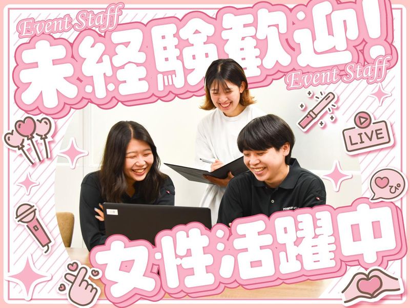 対象となる方 | 求めている人材 【必須条件】 ■普通自動車免許必須(AT限定可) 【こんな方にぜひ!】 *イベントやライブの裏側に関わってみたい *チームで協力しながら働くのが好き *アクティブに動く仕事にチャレンジしたい 活躍中のスタッフの中には 『ライブやフェスが大好き!』 『エンタメに関わる仕事がしたい!』 『今よりもやりがいのある仕事がしたい』 そんな“好き”をきっかけに入社した 女性スタッフもたくさん! 現在は20代・30代の若手中心に活躍中! 女性スタッフも多く在籍しています! |