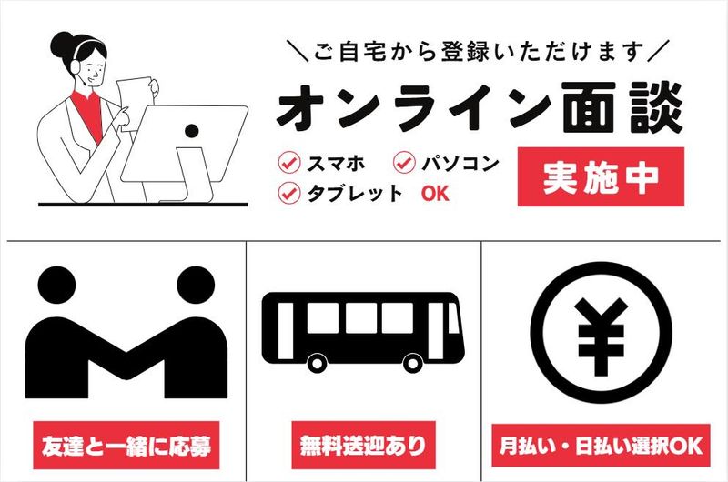 待遇・福利厚生 | 【保険制度】 雇用保険、労災保険、健康保険、厚生年金 【福利厚生】 待遇・福利厚生 【福利厚生】 ◆日払い、月払い選択可 ◆交通費支給(会社規定あり) ◆車通勤、バイク通勤OK ◆行き帰り無料送迎バスあり(営業所発) ◆髪色、髪型、ネイル、ピアスなどオシャレOK ◆服装自由(規定あり) |