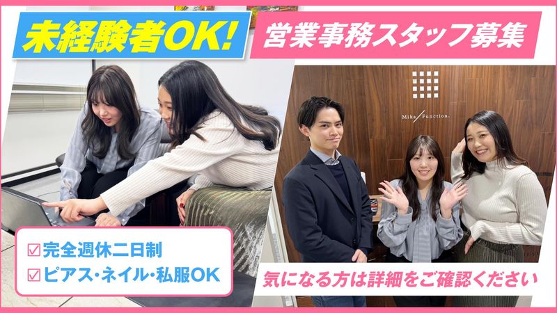 職種/仕事内容 | 仕事内容 \⭐オフィスワークデビュー応援⭐/ 完全週休2日制(土日祝)×服装自由×駅チカ◎ 働きやすさ抜群の環境で、 広告業界にチャレンジしませんか? ー・-・-・-・-・-・-・- \⭐仕事内容⭐/ 内勤スタッフとして、 Indeedの広告運用や、 原稿作成・スケジュール管理、 営業のサポートをお任せします! 具体的には… ✅Excelを使った原稿作成・データ加工 ✅掲載スケジュールの管理 ✅数字・金額管理 ✅データ入力 など Excelでの操作やデータ入力が多く、 数字や金額の管理も発生するため、 「こつこつ作業するのが好き」 という方にピッタリのお仕事です! パソコンは基本操作ができればOK! 最初は先輩がマンツーマンで サポートしますので、 事務未経験の方でも 安心して始められます◎ ー・-・-・-・-・-・-・- \⭐先輩インタビュー⭐/ 「未経験でも安心してスタートできました!」 入社1年半/20代女性/前職:事務職 ――この仕事を選んだきっかけは? 前職でも事務の仕事をしていましたが、 もっと幅広い業界で経験を 積みたいと思い転職しました。 広告業界は初めてで、 少し不安もありましたが、 「未経験OK」と書かれていたので 思い切って応募しました! ――入社してみてどうでしたか? 最初は求人広告の仕組みも わからず緊張していましたが、 先輩が横について丁寧に 教えてくれたので安心でした。 困ったときにすぐ相談できる雰囲気で、 質問しやすい環境です! ――職場の雰囲気を教えてください。 20代が多く、和気あいあいと した雰囲気です! ランチを一緒に食べたり、 プライベートの話で 盛り上がったりしています◎ ー・-・-・-・-・-・-・- \⭐当社の特徴⭐/ 当社はIndeed運用を 中心に行う広告代理店です。 業務拡大に伴い、 新しい仲間を募集しています! 「オフィスワークに挑戦したい」 「広告業界に興味がある」 そんな方を大歓迎♪ 未経験スタートでも 安心して成長できる環境があります! ー・-・-・-・-・-・-・- |