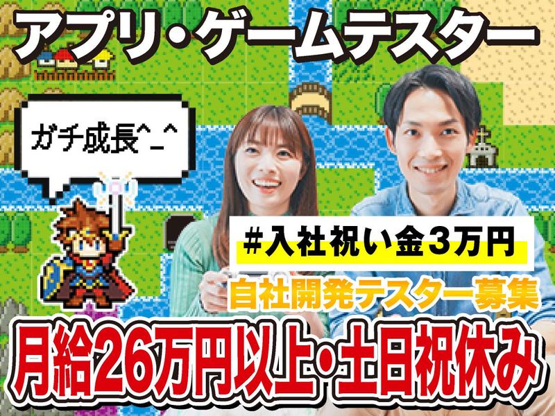 職種/仕事内容 | 仕事内容 ◎ゲーム好きを仕事にしませんか ✅未経験でも月給26万+入社祝い金3万◎ ✅年休125日以上+土日休み&入社日調整可 ✅大手IT企業などと取引先多数! 「パソコンに詳しくない」 「ITって難しそう」 そんな未経験の方も、ゼロから育てる体制が 整っているのが私たちの強み。 将来的には、 ▼ゲームテスター ▼プログラマー ▼システムエンジニア などと、 ステップアップできる環境をご用意。 IT業界で長く活躍したい方にピッタリです! ✅仕事内容  ̄ ̄ ̄ ̄ ̄ ̄ ̄ ̄ ̄ ̄ ̄ ・ゲームの単体・結合・総合テスト ・ゲーム・アプリ・システム等のテスト業務 ・テスト結果の集計 ・バグの調査・修正 ・システムの改修 ※プログラマへのキャリアアップも可能。 テスト対象となるのは、公開前や配信後のアプリ・ゲーム。 プレイを通して、最初に覚えて頂くのは「不具合の見つけ方」や「基本的なゲーム用語」です。 「マニュアルに沿って進行できるかどうか」 「エラーや不具合が存在しないか」 をチェックし、作品を完成へ導く大切な工程を担います。 やり遂げたときの達成感も大きいお仕事です! ✅キャリアステップ例  ̄ ̄ ̄ ̄ ̄ ̄ ̄ ̄ ̄ ̄ ̄ ▼ゲームテスターとしてスタート ▼デバッカーやゲームプログラマに ▼アプリ開発やゲーム開発のプロフェッショナルに! ✅様々なキャリアアップが可能  ̄ ̄ ̄ ̄ ̄ ̄ ̄ ̄ ̄ ̄ ̄ ̄ ̄ ̄ ̄ ゲームだけに留まらず、システムやアプリ設計・開発、ネットワークの構築などをへのキャリアチェンジや、ゆくゆくは、生成AIなどの最先端技術に携わる事も可能です! |