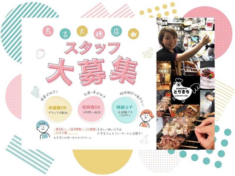 勤務地 | 炭火焼鳥専門店 鳥吉 大穂店 茨城県つくば市筑穂3-1-8 |