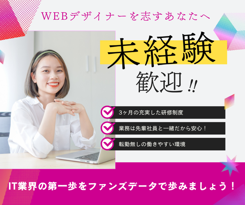職種/仕事内容 | 仕事内容 株式会社ファンズデータは、“楽しく働けるスキルを共に築く会社”です。 「楽しむ(fun)姿にはファン(fan)がつく」という信念のもと、技術力だけでなく、「人間性」や「コミュニケーション力」を大切にし、お客様に必要とされる企業を目指している会社です。私たちは、日本をアップデートするためにIT技術を活用し、次世代が生まれ育った「良い日本」を作り上げることに強い使命感を持っています。 社員一人ひとりが全力で働き、楽しむ姿勢を持つことで、「ファン」を増やし、明るい未来を共に築いていきます。株式会社ファンズデータでは、IT業界未経験の方にも安心して学べる研修制度を整え、経験豊富な講師陣のサポートで成長をサポートします。 「経験がないから、自分には無理かもしれない」 そんな不安に寄り添い、ITの基礎から学べる3ヶ月間の研修制度を整備しています。 一人ひとりの“はじめの一歩”を大切にしながら、 継続的に成長をサポートする体制を整えています。 【ゼロから、“魅せる”デザイナーへ】 \「デザインって楽しそう!」その気持ち、大歓迎です!/ 「SNSで見た、オシャレなバナー」 「自分だけのポートフォリオサイトを作ってみたい」 そんな“ちょっとした憧れ”が、あなたのキャリアの第一歩になるかもしれません。 私たちは、未経験からWebデザイナーを目指せる研修制度と環境を整え、 あなたの「やってみたい」を全力でサポートします! 【お仕事内容】 まずは、研修で基礎をしっかり学んだ後、 以下のような仕事にチャレンジしていきます! ・SNSバナー・Web広告のデザイン作成 ・WebサイトやLPのレイアウトデザイン ・HTML/CSSを使ったページ制作(コーディング) 「デザインもできて、コーディングもできる」 そんな“オールラウンダー”を目指せる環境です! 【3ヶ月で、あなたを“Webデザイナー”に育てます】 完全オンラインの研修だから、全国どこからでも参加OK! 未経験でも安心して学べるカリキュラムが揃っています。 【研修内容】 ✅1ヶ月目 「Webデザインの基礎理解と感性づくり」 ・UI/UXの基礎知識を理解する ・PhotoshopやIllustratorの基本操作を習得 ✅2ヶ月目 「デザインツールでの実践スキル習得」 ・Photoshop/Illustratorの応用操作 ・SNSや広告用バナー、LPパーツの制作演習 ・良いデザインパターンの分析と再現トレーニング ✅3ヶ月目 「HTML・CSSの基礎から実践コーディング」 ・HTMLの構造と基本タグの理解 ・CSSで色やフォント、レイアウトを指定する方法を習得 ・シンプルなLPや2カラムWebサイトを実際にコーディング 分からないことは、チャットやオンライン面談でいつでも相談OK! 講師や先輩が“放置しない”ので、置いていかれる心配はありません。 【研修後はこんな未来が待っています】 4ヶ月目からは実際のプロジェクトに参加! まずは簡単なバナー制作からスタートし、 経験を積んでいけば、こんな仕事にもチャレンジできます! ✨アニメーションやJavaScriptを使った動きのあるサイト ✨ECサイトのデザイン・運用 ✨LPの構成から設計・実装まで一気通貫で担当 「ただの作業者」ではなく、“提案できるデザイナー”を目指せる環境です! <求める人物像> 以下に当てはまる方、大歓迎! ■変わりたい気持ちを行動に移せる方 「このままでいいのかな?」と思ったことがあるなら、それは成長のサインです。 IT業界には、未経験からでも挑戦できるチャンスがあります。 必要なのは、“やってみたい”という思いと、学ぶ姿勢。 経験は問いません。大切なのは、変わりたいと思った自分を信じて、一歩を踏み出せるかどうかです! ■素直に学べる方 最初は誰でも初心者です。だからこそ、吸収力のある今がチャンスです。 教えてもらったことを素直に受け入れ、前向きに取り組める方、大歓迎です! ■行動しながら考えられる方 「自分に合っているか分からない」そんな状態でも大丈夫です。 まずはやってみて、少しずつ自分に合ったやり方を見つけていけばOKです! いろんな業務にチャレンジしながら、自分の得意や興味を一緒に見つけていきましょう! ■頑張りをしっかり評価してほしい方 努力をきちんと見てくれる環境で働きたい方にぴったりです。 年齢や経歴に関係なく、やる気や成果をしっかり評価します。 「未経験だけど、しっかりキャリアを築きたい」 そんな熱意を持った方を応援します! <勤務地・働き方> ・原則フルリモート勤務(在宅勤務)可能 ※スキルや経験に応じて、出社をお願いする場合があります。 ・下記のエリアでプロジェクトあり 東京/神奈川/埼玉/千葉/大阪/名古屋/福岡/広島/札幌 ・転勤なし/希望者はオフィス勤務も可能(駅チカのオフィスあり) ※一部プロジェクトでは、月に数回の出社をお願いする場合があります。 そのため、プロジェクト先への通勤が可能な範囲にお住まいの方を対象とさせていただいています。 \あなたの“センス”が、未来を変えるかも/ 経験もスキルもなくてOK。 「やってみたい」そ