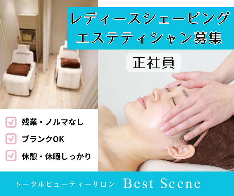 職種/仕事内容 | 仕事内容 ◆トータルビューティーサロン『Best Scene』 レディースシェービングエステティシャンを大募集! 「キレイになりたい」「身だしなみを整えたい」 「きちんとしたい」を満たすメニューで、お客様の お手伝いをしております。 ◆仕事&職場の雰囲気 レディースシェービングと、コースに含まれるエステを行っていただきます。 普段ケアに加えブライダルの需要も有! スタッフ同士楽しく仕事をしているので仲がよく働きやすい職場です。 子育て中のスタッフも活躍しています! ◆こんな方におすすめです! ●理容師をしてきたけどレディースシェービングを専門にしていきたい!という方にぴったり♪ ●ブランクがある方も歓迎!事情があって 一度理容師をやめてしまった・・・という方も歓迎!スタッフが1からサポートして仕事を教えます!せっかく取った「理容師免許」もう一度活かしてみませんか? ●ノルマ無し◎残業なし! シェービング・エステに専念できます♪ |