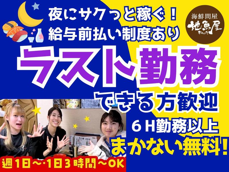 職種/仕事内容 | 仕事内容 ホールスタッフをオープニング級の大募集!! 声を掛け合いながら、仲間とフォローし合いながら「地魚屋」での仕事は進んでいきます。だからチームワークはとても大切です。 忙しい時には、他のポジションのスタッフ同士がお互いにフォローすることもあります。 仲間と一緒に乗り切った達成感は、なかなか得られない格別なものです。 【時間の融通が利きます】 19時・20時からゆったり出勤◎ 日中は学校や予定がある方、遅い時間から仕事を希望されている方にもピッタリ!授業や部活・サークル帰りの学生さんや、Wワークで遅い時間からの勤務をされるスタッフからも好評です。短時間勤務(1日3h以内)も可能です。勤務日数は週1日〜OKでシフト相談可能!ライフスタイルに合わせて働きやすいのが特徴です! 【在籍スタッフ】学生さんをはじめ様々 「授業終わりにサクッと」という大学生や専門学生をはじめ、主婦(夫)やフリーターなど様々な属性のスタッフが在籍!20代から50代・60代まで、幅広い世代が活躍しています。 【未経験の方◎】 明るく優しい対応ができれば、未経験でも大丈夫。ぜひお客様とのコミュニケーションを楽しみながら活躍してください! 難しい作業はありませんので、アルバイトが初めての方でも安心してお仕事をスタートできます。 慣れてきたら、新しい業務にもどんどんチャレンジしてください! 【様々な年齢層の方が勤務】 勤務は「週1日~OK」で融通の利きやすさは抜群! ・テストや部活で忙しい学生さん ・家事・育児の両立を目指す主婦(夫)さん ・レギュラー勤務でがっつり稼ぎたいフリーターさん 全員を歓迎できる環境が整っています◎ 年齢に関係なく、和気あいあいと楽しい雰囲気の職場です〇 【地魚屋浜松町店で働く魅力】 ・週1日、1日3時間~OK! ・髪型・髪色自由!ピアスやネイルなどもOK ・未経験歓迎!大学生/外国人/シニアの方も活躍中! ・給与前払い制度あり! 【給与前払い制度有り】 働いた分の一部を先に受け取ることのできる給与前払い制度があります。 ※各種規定あり 【頑張れる職場づくりを目指して】 ・昇給制度(随時) 【仕事内容】ホール中心のお仕事 ・お客様のご案内、席への誘導 ・オーダー取り(ハンディ端末使用) ・お料理、ドリンクの提供 ・テーブルの片付け、清掃 ・レジ業務(簡単な操作です) ・開店・閉店準備のサポート ※店舗の状況により、キッチンのお仕事をお任せする場合もあります。 【時間帯ごとの業務内容】 10:30〜11:30 開店準備 店内清掃、テーブルセット、ランチの準備など 11:30〜 ランチ営業 12:00〜13:00 ピークタイム お客様のご案内、オーダー取り、料理・ドリンク提供など、チームワークで乗り切ります! 14:30〜16:30 クローズタイム ランチ片付け、ディナー準備、休憩 16:30〜 ディナー営業 18:00〜22:00 ピークタイム お客様のご案内、オーダー取り、料理・ドリンク提供など、チームワークで乗り切ります! 22:30〜23:00 閉店作業 テーブルの片付け、洗い物、簡単な清掃など 【正社員登用有り】 実績多数。正社員登用を積極的に行っています。 【私服OK】お気軽に面接へお越しください◎ ・面接時履歴書の持参不要 ・年齢、経験、もちろん不問!応募者全員面接中! ・お友達と一緒に応募OK!面接OK! ・面接は私服でOK |