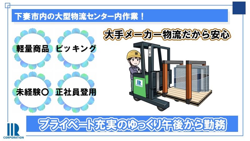 職種/仕事内容 | タイトル 下妻市内【賞与・昇給あり】工場内での製品仕分け作業【住宅用網戸の出荷作業員】 職種 梱包・仕分け・ピッキング 雇用形態 正社員 仕事内容 未経験からチャレンジできる大手住宅メーカー工場での作業です! 資格がない方も「資格取得支援制度」で資格を取得して戴けます! 重量物はありません。 年間休日125日(土日祝お休み) 正社員登用後は賞与/昇給ありの待遇となります! 〇一人でもくもくと作業をしたい 〇チームワークでの仕事 そんなあなたにぴったりのお仕事です! 研修は、現職スタッフが「しっかりサポート」しますので安心して下さい 【仕事内容】 工場内での網戸製品の仕分け作業です。 (扱う商品は網戸なので、すごく軽いです) ◆1日の流れ 08:30~ ラジオ体操・朝礼 08:40~ 出荷作業開始(数量チェック・荷造り) 10:10~ 小休憩(10分) 10:20~ 出荷作業の続き 12:00~ 昼休憩(40分) 12:40~ 出荷作業の続き 15:10~ 小休憩(10分) 15:20~ 翌日の段取り(網戸の仕分け) 17:20~ 終業 ※作業の進捗により残業をお願いする場合があります 募集の背景 私たちは、大手メーカーの住宅製品を扱っています。 網戸は、住空間を快適にするアイテムです! 私たちと一緒に、快適生活のお手伝いをしませんか! ※契約社員として6ヶ月間ご勤務いただき、6ヶ月以降は正社員(無期雇用・賞与/昇給/退職金あり)としてのご勤務となります。 |