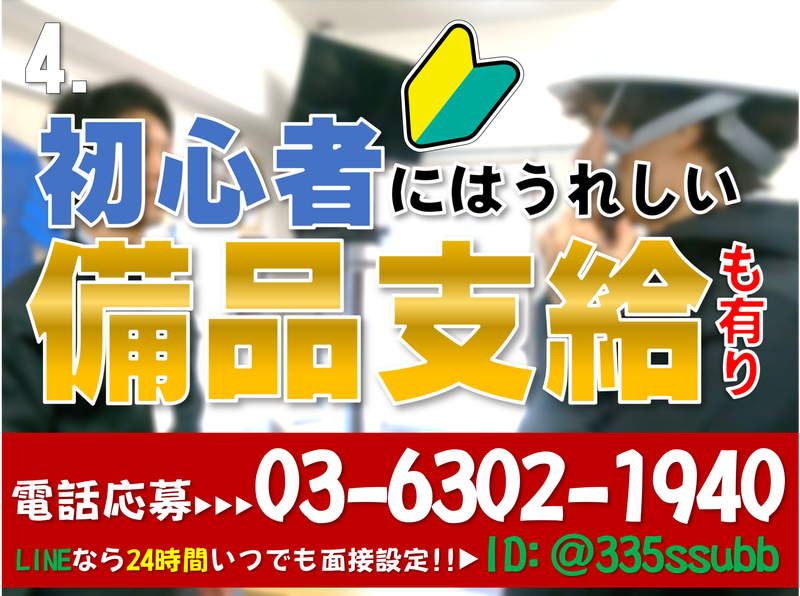 職種/仕事内容 | 仕事内容 《建築現場の清掃・片付け等の現場軽作業スタッフ》 日払いOKで、スグ給与!ほぼ毎日が給料日も可能! ・LINEなら24時間いつでも面接予約OK! <仕事内容> 多能工の仕事とは、現場の清掃片付け・養生・資材移動・職人さんの 手元作業と多種多様なニーズに答える仕事です。 ・軽作業が多いので、極端な肉体労働ではありません。 仕事で体を酷使したくない方もOK! ・難しい道具や技術が必要な仕事ではないので、 稼働2~3日で慣れてくるスタッフも多いですよ! ・未経験者には、1日通して本社で実技研修行います。 ・道具の使い方や、現場アルアルなどしっかり教えるので安心して下さい! ・初日は先輩がマンツーマンで作業を教えます。 <1日の流れ(例)> 1、準備・・・現場到着後、当日の作業内容の説明を受けて作業開始。 2、作業・・・養生などで作業しやすい現場作りをしていきます。 3、休憩・・・10時~、12時~、15時~に休憩 4、片付け・・・最後に資材の片付けや移動、清掃をして終わりです。 <業務量は安定!> 規模の大小を問わず、560社以上の企業と取引があるので、 業務量は安定しています。 ・「働きたいけど案件が無くて・・・」ということはありません 長い目線で安定して働いていくことができます。 ・現場が終わったら次の現場へ!人間関係も煩わしくありません! <勤務地> 勤務地は関東一円に多数!もちろん希望を考慮いたします。 ・現場は直行直帰OK ・担当していただく現場は多数 都内各所 多摩エリア 東京西エリア 城北エリア(板橋区・埼玉方面) 城東エリア(江戸川区・江東区等) 東京南エリア(品川・川崎周辺) ・現在マンション大規模改修工事において、 東京・神奈川・千葉・埼玉と各所で人手不足です。 - <LINE応募でラクラク> ・「LINE友達登録」で、ID登録せずに簡単に応募・面接が完了! ・LINEなら24時間いつでも面接予約OK! ※LINE ID:@335ssubb ※登録後、応募の旨を一言ご連絡いただければ、折り返し致します。 <HPにも当社の情報載っています> https://www.kouken-guidebook.com/recruit-site |