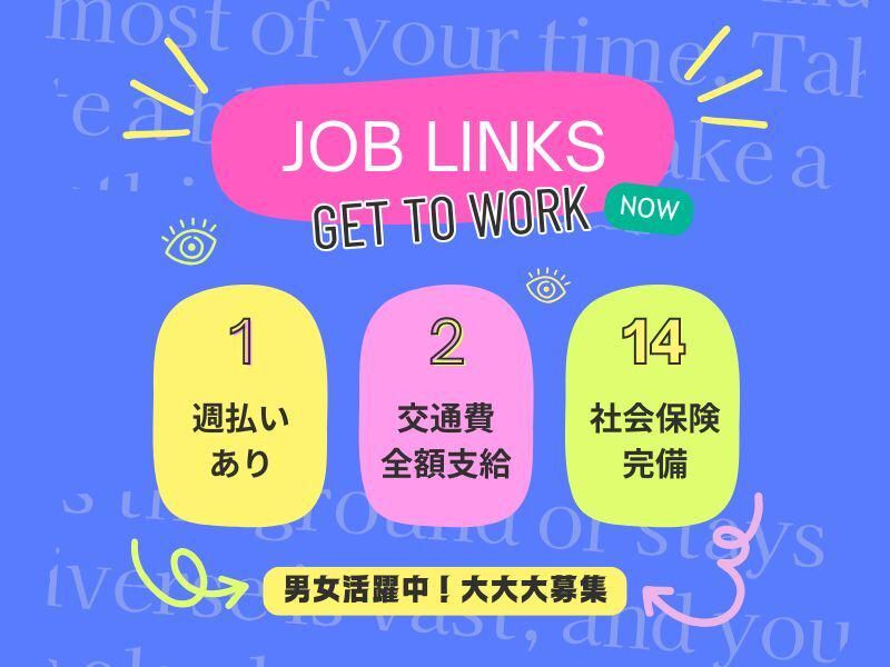 職種/仕事内容 | 仕事内容 新設された京都十条の半導体部品製造工場にて、 未経験からスタートできる製造サポートスタッフを募集します。 高時給1,500円、完全土日祝休みのため、 プライベートの時間もしっかり確保できます。 工場は京都市、京都市南区、京都市下京区、 京都市伏見区、大阪市からアクセスしやすい好立地。 多くのスタッフがこれらの地域から通勤しています。 主な業務は、金型を使った半導体部品の組み立て・交換、 サンプルの試作や測定、製品の外観チェック・写真撮影など シンプルな作業が中心です。 また、Excelを使ったデータ入力業務もお任せします。 入社時にはマニュアルや手順書による研修があり、 実際の作業は丁寧にサポートする先輩がつきますので、 工場勤務が初めての方やブランクがある方も 安心して始められます。 現在、20代~50代のスタッフが幅広く活躍中。 「未経験でもしっかり教えてもらえる」 「分からないことはすぐに質問できる」と 好評の職場です。 コツコツ作業が得意な方、正確性を活かしたい方、 ものづくりに興味がある方にぴったり。 必要なのは基本的なパソコン操作 (Excelへの入力作業ができる程度)だけで、 特別な知識や経験は問いません。 交通費全額支給・社会保険完備・有給休暇(6ヶ月後付与)・ 週払いOKなど福利厚生も充実。 工場見学やスマホでのリモート面接も可能なので、 お仕事の内容をしっかり確認してからスタートできます。 「新しい職場で一歩踏み出したい」 「安定収入と充実した私生活、どちらも大切にしたい」 そんな方のチャレンジを、スタッフ一同全力で応援します。 |