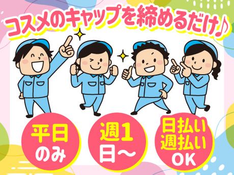 職種/仕事内容 | 仕事内容 資格・経験必要ナシのカンタンお仕事♪ 【コスメのキャップ締め作業】 *キャップ締め作業の流れ 作業はとてもシンプルで、コスメ製品のボトルや容器のキャップを締めることがメインの仕事です。 ライン作業で、流れてくるコスメのボトルを受け取り、決められた位置に正確にキャップを取り付けていきます。 キャップをしっかり締めることで、製品が漏れないようにする大事な工程です。 *単純作業だからこその安心感 キャップ締め作業は単純作業なので、慣れるのが早く、作業を進めていくうちにスピードアップできます。 初めての方でもすぐに覚えられるシンプルな内容で、難しい技術や経験は必要ありません。 繰り返し行うことで、自然と作業に自信がつきます。 【工場ワーク初心者でも安心】 軽作業のため体への負担が少なく、長時間でも安心して作業ができます。 初めて工場で働く方でも、特別なスキルがなくても問題なし! 先輩スタッフがしっかりとフォローしてくれるので、初心者の方でも安心して始められます。 友達同士での応募もOK 安定した作業環境 工場内は空調完備で快適な作業環境が整っており、季節に関係なく快適に働けます。 また、作業はチームで進めることが多いため、協力して進める雰囲気も良いです。 ★ご紹介できるお仕事は他にもあります! *短期で働きたい *平日だけがいい *扶養内で働きたい *Wワークで働きたい 等、条件は案件によって異なりますので お気軽にご相談くださいね◎ さまざまなお仕事先があるので まずはお問い合わせだけでもOK! |
